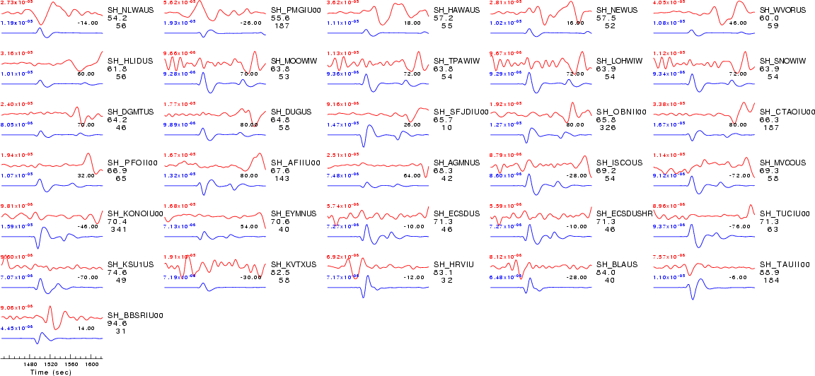 | Comparison of the observed traces (red) and solution predicted traces (blue) ordered in terms of increasing epicentral distance. Each pair of traces is annotated with the station name, epicentral distance in degrees, source to station azimuth in degrees. Each pair of traces is plotted with the same scale and the peak amplitudes are indicated at the lect of each trace. Finally the time shift between the P-wave first arrival picked and the the theoretical P-wave first arrival in the predicted trace is indicated, with a positive sign indicating that the predicted trace has been shifted to the right by the given number of seconds. as a function of source to station azimuth in degrees (D). The purpose of this display is to highlight the azimuthal dependence on the first motion. The traces are annotated with the station name at the top. |