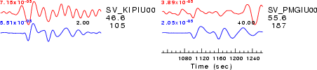 All observed and Greens function waveforms are corrected to instrument response to ground velocity in meters/sec for the passband of 0.004 - 5 Hz. The traces were then lowpass filtered at 0.25 Hz and interpolated to a sample rate of 1 second.
