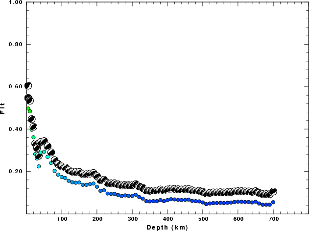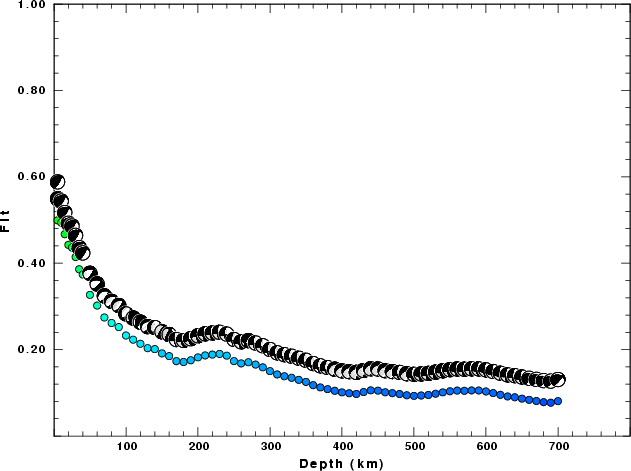 | Goodness of fit as a function of source depth. The measure is 1 - SUM (o -p)2 / SUM o2. A value of 1.0 is the best fit. The best double couple mechanism for the solution depth is plotted above goodness of fit value to indicate how the mefhanism may change with depth. |