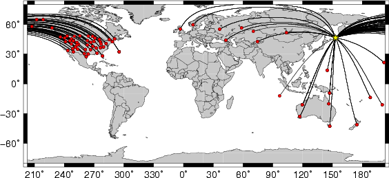 Location of the earthquake (yellow star) and great circle path from the epicenter to each station (red) [created using GMT (Wessel, P., and W. H. F. Smith, New version of Generic Mapping Tools released, EOS Trans. AGU, 76 329, 1995.)] |