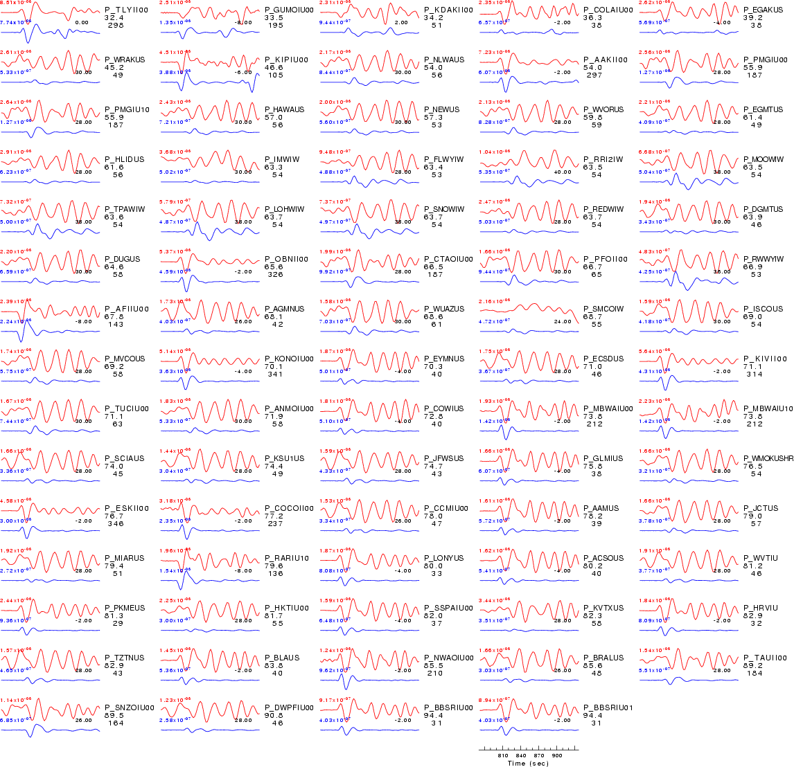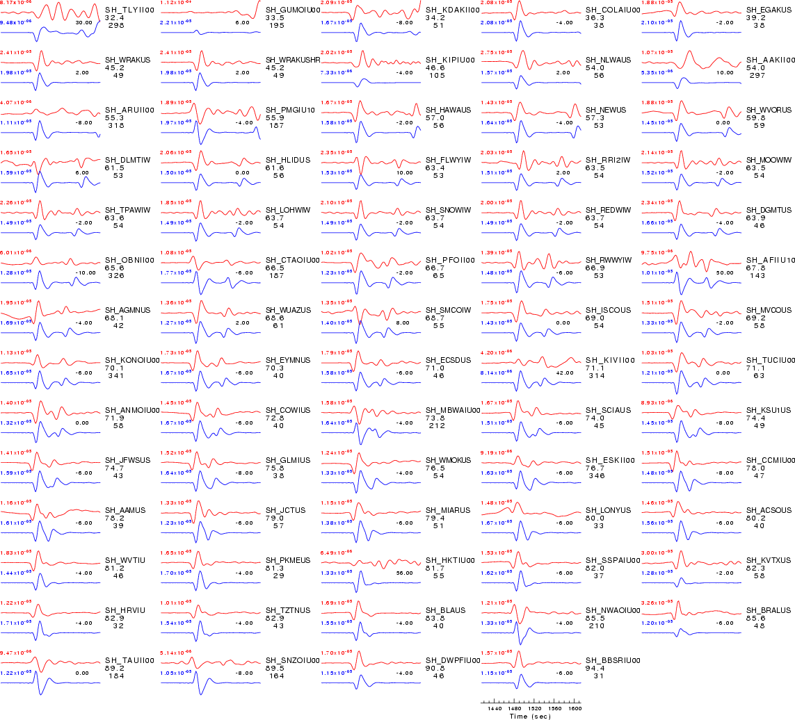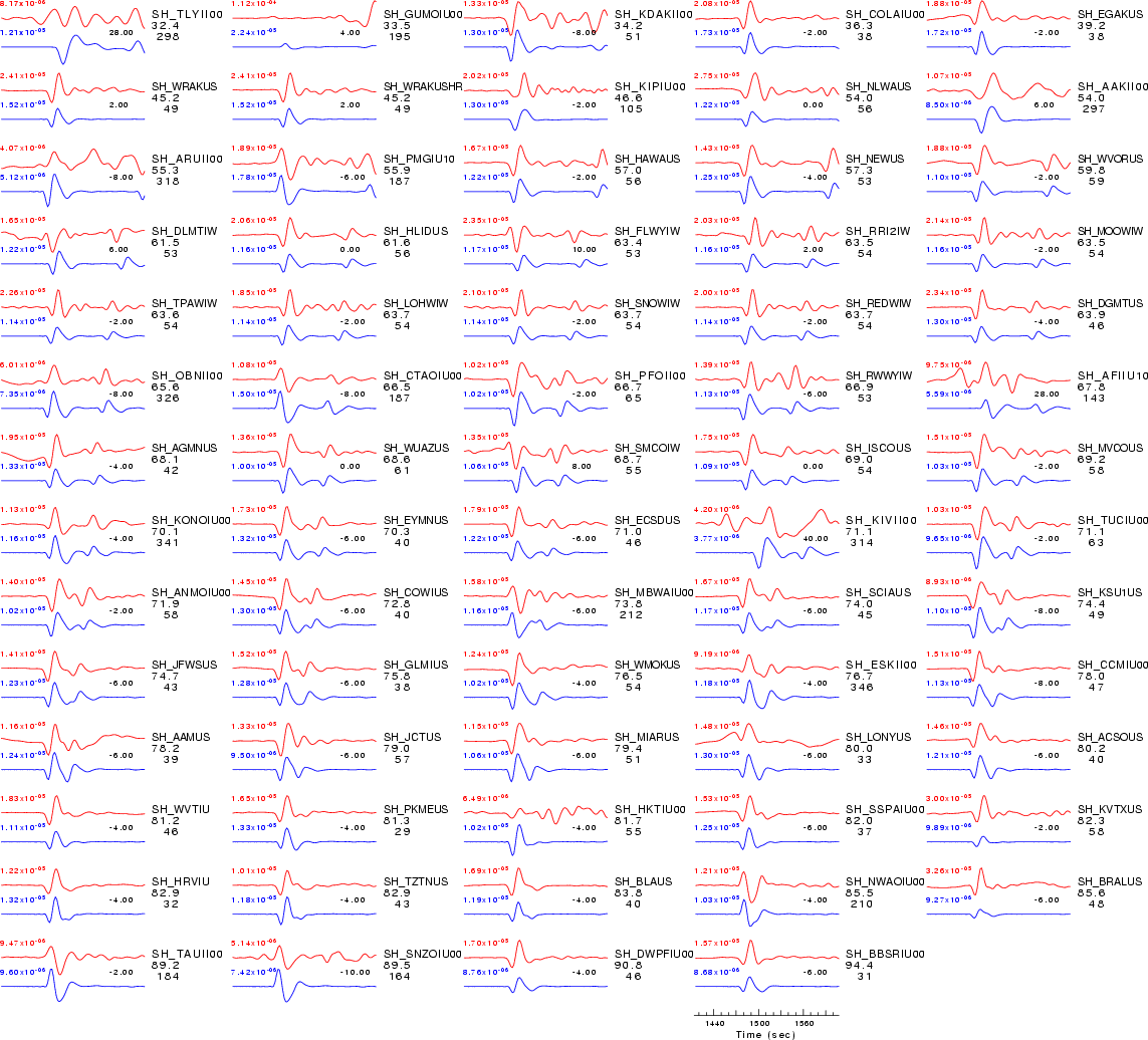 | Comparison of the observed traces (red) and solution predicted traces (blue) ordered in terms of increasing epicentral distance. Each pair of traces is annotated with the station name, epicentral distance in degrees, source to station azimuth in degrees. Each pair of traces is plotted with the same scale and the peak amplitudes are indicated at the lect of each trace. Finally the time shift between the P-wave first arrival picked and the the theoretical P-wave first arrival in the predicted trace is indicated, with a positive sign indicating that the predicted trace has been shifted to the right by the given number of seconds. as a function of source to station azimuth in degrees (D). The purpose of this display is to highlight the azimuthal dependence on the first motion. The traces are annotated with the station name at the top. |