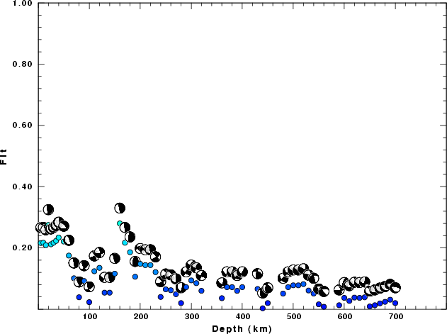 | Goodness of fit as a function of source depth. The measure is 1 - SUM (o -p)2 / SUM o2. A value of 1.0 is the best fit. The best double couple mechanism for the solution depth is plotted above goodness of fit value to indicate how the mefhanism may change with depth. |