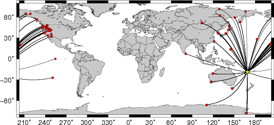 Location of the earthquake (yellow star) and great circle path from the epicenter to each station (red) [created using GMT (Wessel, P., and W. H. F. Smith, New version of Generic Mapping Tools released, EOS Trans. AGU, 76 329, 1995.)] |