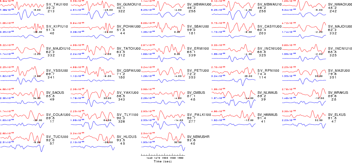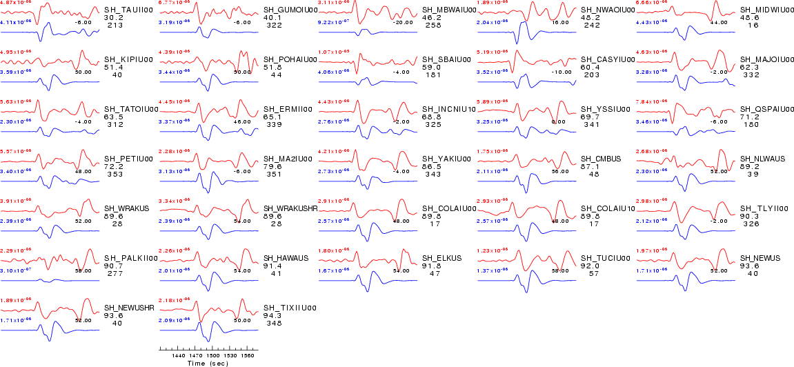 | Comparison of the observed traces (red) and solution predicted traces (blue) ordered in terms of increasing epicentral distance. Each pair of traces is annotated with the station name, epicentral distance in degrees, source to station azimuth in degrees. Each pair of traces is plotted with the same scale and the peak amplitudes are indicated at the lect of each trace. Finally the time shift between the P-wave first arrival picked and the the theoretical P-wave first arrival in the predicted trace is indicated, with a positive sign indicating that the predicted trace has been shifted to the right by the given number of seconds. as a function of source to station azimuth in degrees (D). The purpose of this display is to highlight the azimuthal dependence on the first motion. The traces are annotated with the station name at the top. |