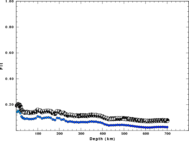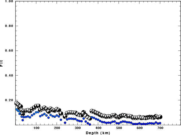 | Goodness of fit as a function of source depth. The measure is 1 - SUM (o -p)2 / SUM o2. A value of 1.0 is the best fit. The best double couple mechanism for the solution depth is plotted above goodness of fit value to indicate how the mefhanism may change with depth. |