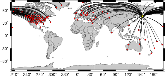 Location of the earthquake (yellow star) and great circle path from the epicenter to each station (red) [created using GMT (Wessel, P., and W. H. F. Smith, New version of Generic Mapping Tools released, EOS Trans. AGU, 76 329, 1995.)] |