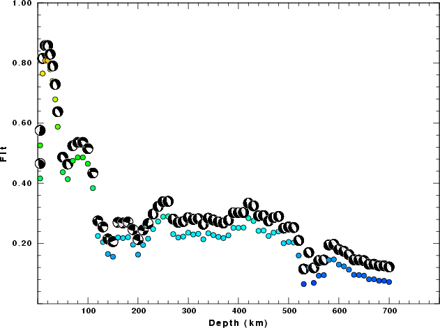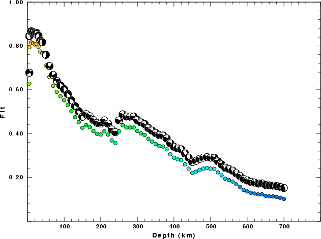 | Goodness of fit as a function of source depth. The measure is 1 - SUM (o -p)2 / SUM o2. A value of 1.0 is the best fit. The best double couple mechanism for the solution depth is plotted above goodness of fit value to indicate how the mefhanism may change with depth. |