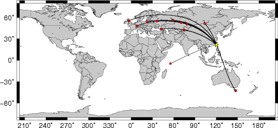 Location of the earthquake (yellow star) and great circle path from the epicenter to each station (red) [created using GMT (Wessel, P., and W. H. F. Smith, New version of Generic Mapping Tools released, EOS Trans. AGU, 76 329, 1995.)] |