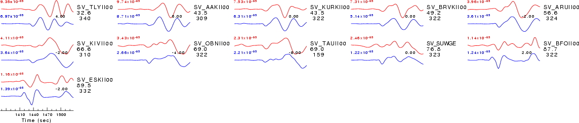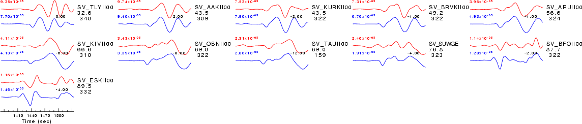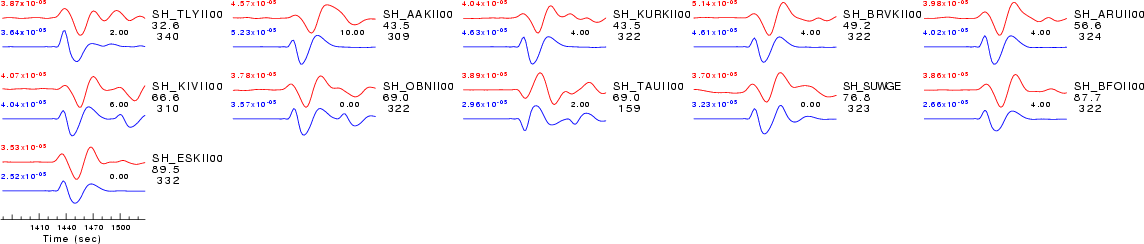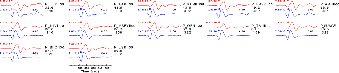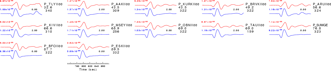 | Comparison of the observed traces (red) and solution predicted traces (blue) ordered in terms of increasing epicentral distance. Each pair of traces is annotated with the station name, epicentral distance in degrees, source to station azimuth in degrees. Each pair of traces is plotted with the same scale and the peak amplitudes are indicated at the lect of each trace. Finally the time shift between the P-wave first arrival picked and the the theoretical P-wave first arrival in the predicted trace is indicated, with a positive sign indicating that the predicted trace has been shifted to the right by the given number of seconds. as a function of source to station azimuth in degrees (D). The purpose of this display is to highlight the azimuthal dependence on the first motion. The traces are annotated with the station name at the top. |