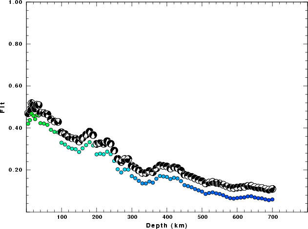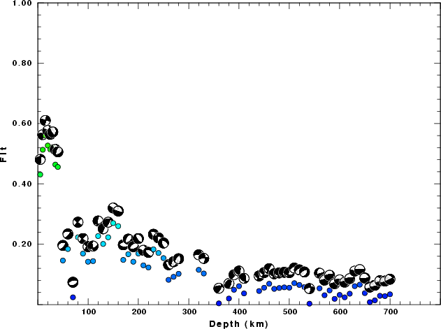 | Goodness of fit as a function of source depth. The measure is 1 - SUM (o -p)2 / SUM o2. A value of 1.0 is the best fit. The best double couple mechanism for the solution depth is plotted above goodness of fit value to indicate how the mefhanism may change with depth. |