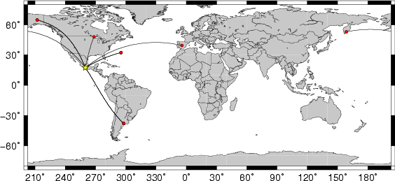 Location of the earthquake (yellow star) and great circle path from the epicenter to each station (red) [created using GMT (Wessel, P., and W. H. F. Smith, New version of Generic Mapping Tools released, EOS Trans. AGU, 76 329, 1995.)] |