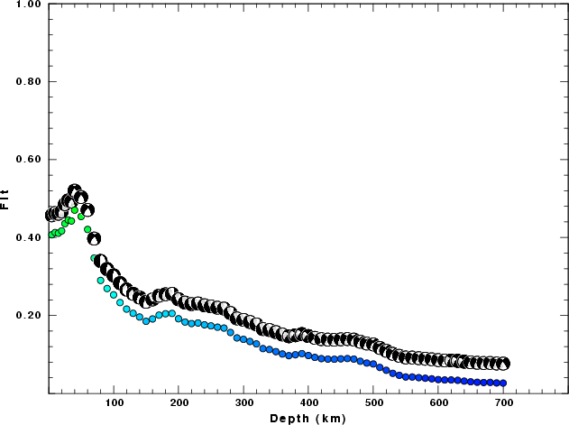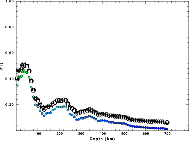 | Goodness of fit as a function of source depth. The measure is 1 - SUM (o -p)2 / SUM o2. A value of 1.0 is the best fit. The best double couple mechanism for the solution depth is plotted above goodness of fit value to indicate how the mefhanism may change with depth. |