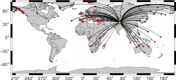 Location of the earthquake (yellow star) and great circle path from the epicenter to each station (red) [created using GMT (Wessel, P., and W. H. F. Smith, New version of Generic Mapping Tools released, EOS Trans. AGU, 76 329, 1995.)] |