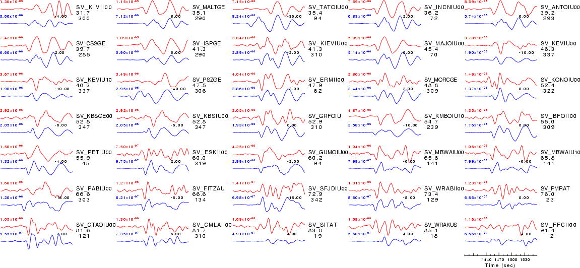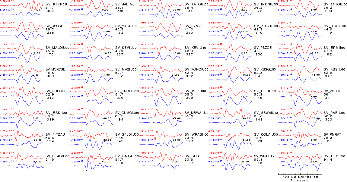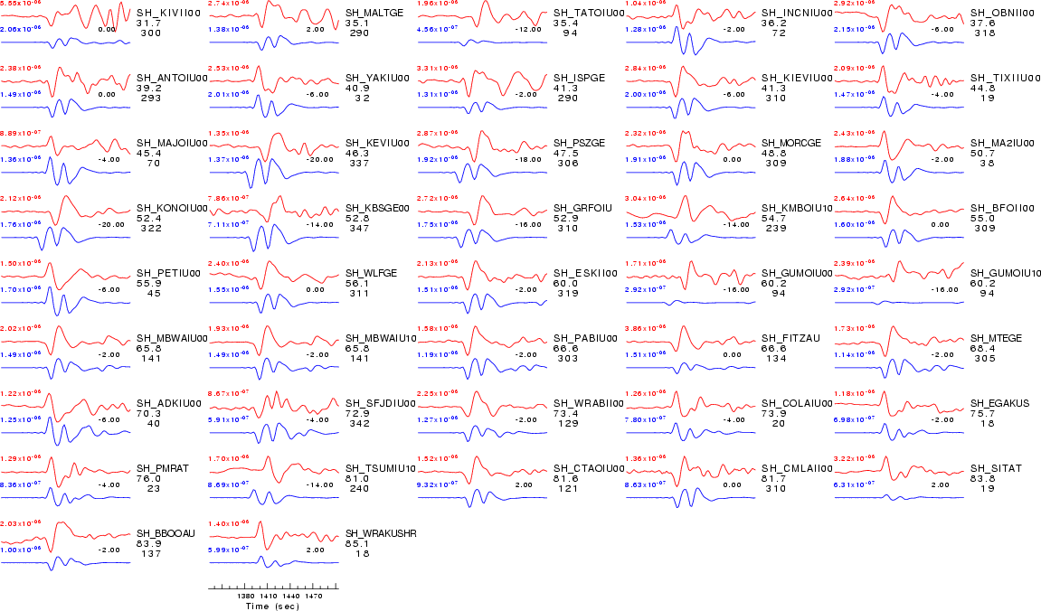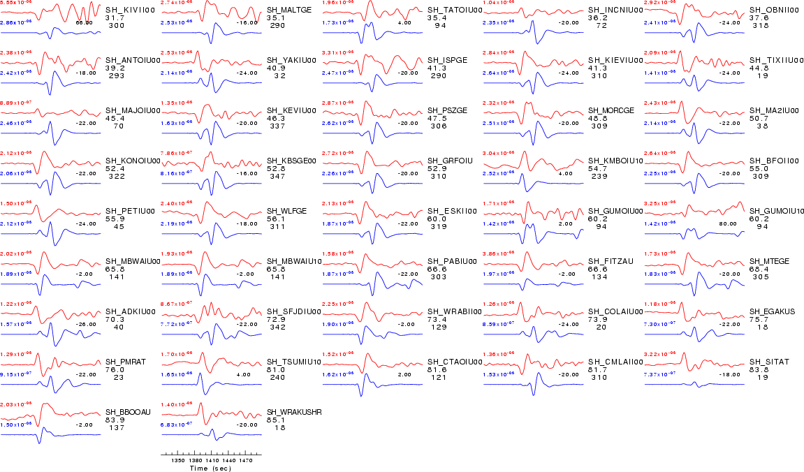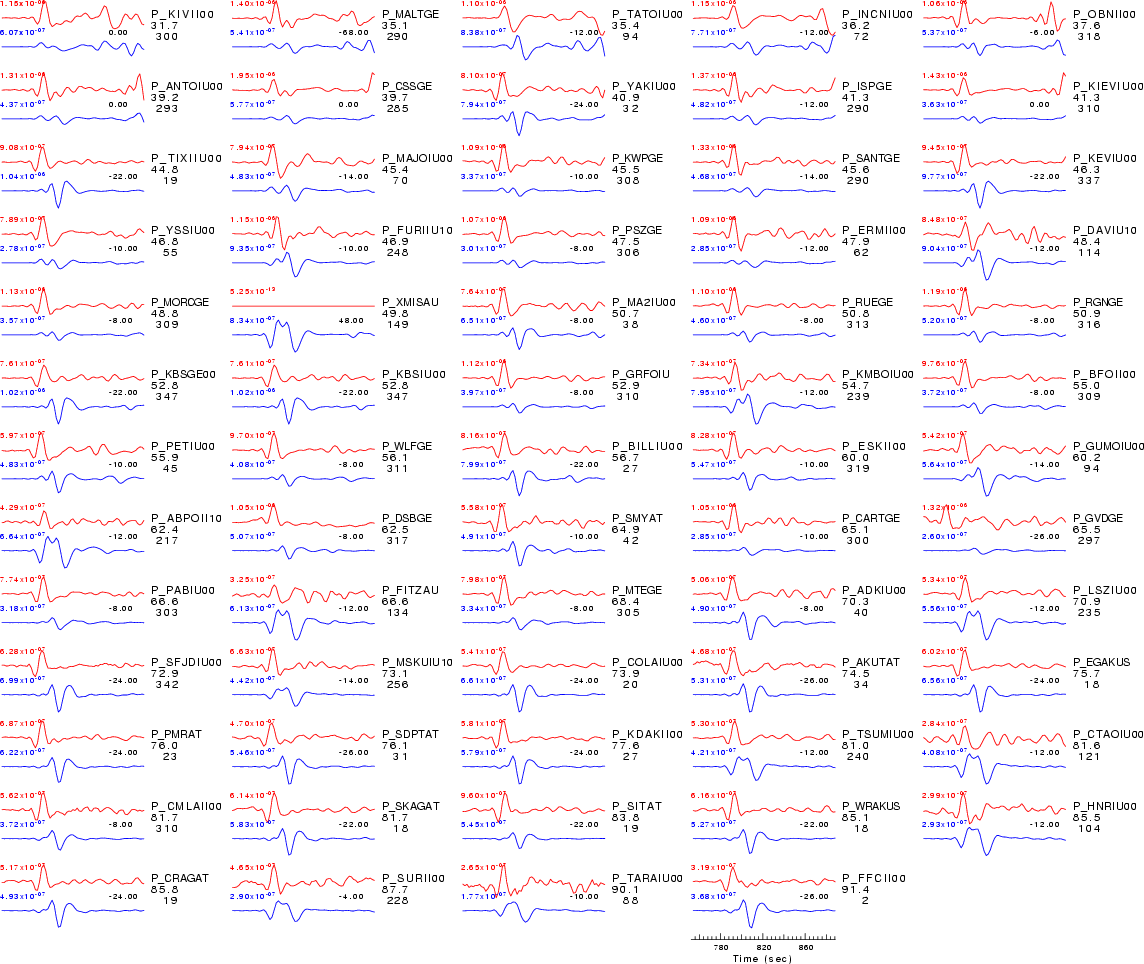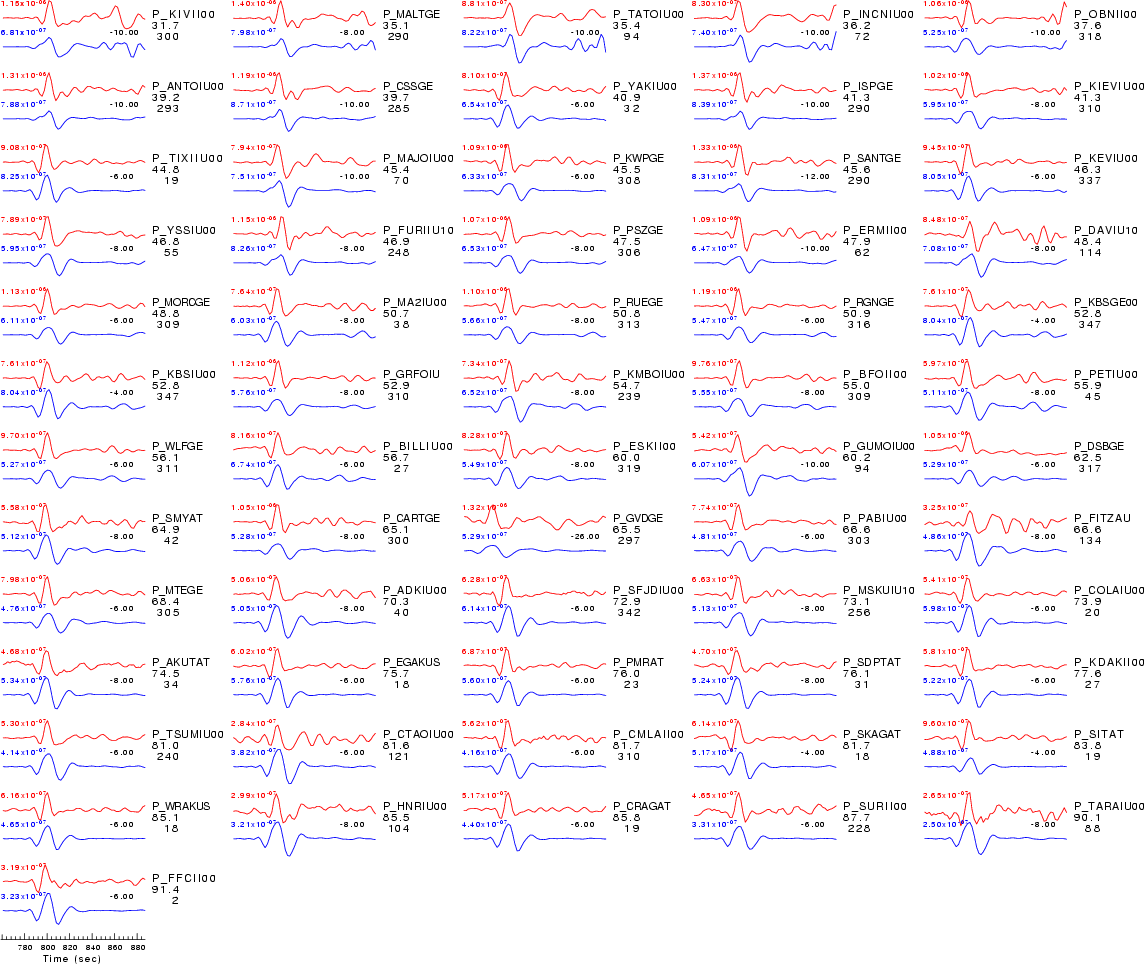 | Comparison of the observed traces (red) and solution predicted traces (blue) ordered in terms of increasing epicentral distance. Each pair of traces is annotated with the station name, epicentral distance in degrees, source to station azimuth in degrees. Each pair of traces is plotted with the same scale and the peak amplitudes are indicated at the lect of each trace. Finally the time shift between the P-wave first arrival picked and the the theoretical P-wave first arrival in the predicted trace is indicated, with a positive sign indicating that the predicted trace has been shifted to the right by the given number of seconds. as a function of source to station azimuth in degrees (D). The purpose of this display is to highlight the azimuthal dependence on the first motion. The traces are annotated with the station name at the top. |