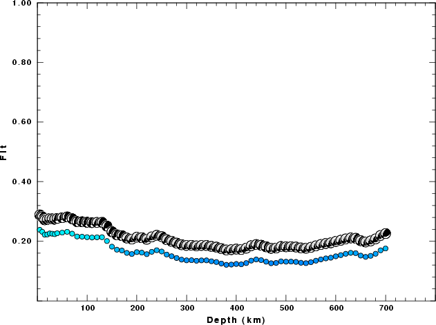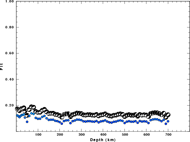 | Goodness of fit as a function of source depth. The measure is 1 - SUM (o -p)2 / SUM o2. A value of 1.0 is the best fit. The best double couple mechanism for the solution depth is plotted above goodness of fit value to indicate how the mefhanism may change with depth. |