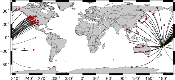 Location of the earthquake (yellow star) and great circle path from the epicenter to each station (red) [created using GMT (Wessel, P., and W. H. F. Smith, New version of Generic Mapping Tools released, EOS Trans. AGU, 76 329, 1995.)] |