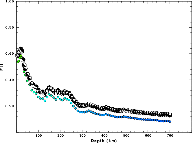 | Goodness of fit as a function of source depth. The measure is 1 - SUM (o -p)2 / SUM o2. A value of 1.0 is the best fit. The best double couple mechanism for the solution depth is plotted above goodness of fit value to indicate how the mefhanism may change with depth. |