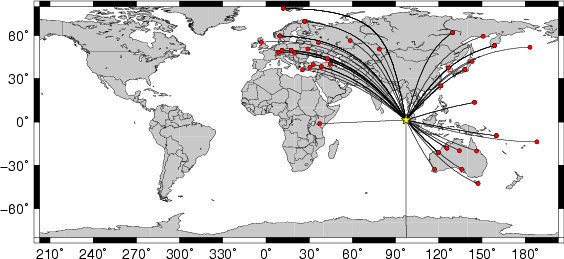 Location of the earthquake (yellow star) and great circle path from the epicenter to each station (red) [created using GMT (Wessel, P., and W. H. F. Smith, New version of Generic Mapping Tools released, EOS Trans. AGU, 76 329, 1995.)] |