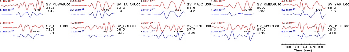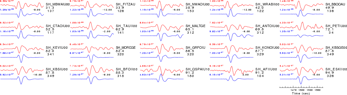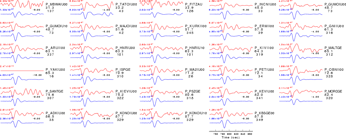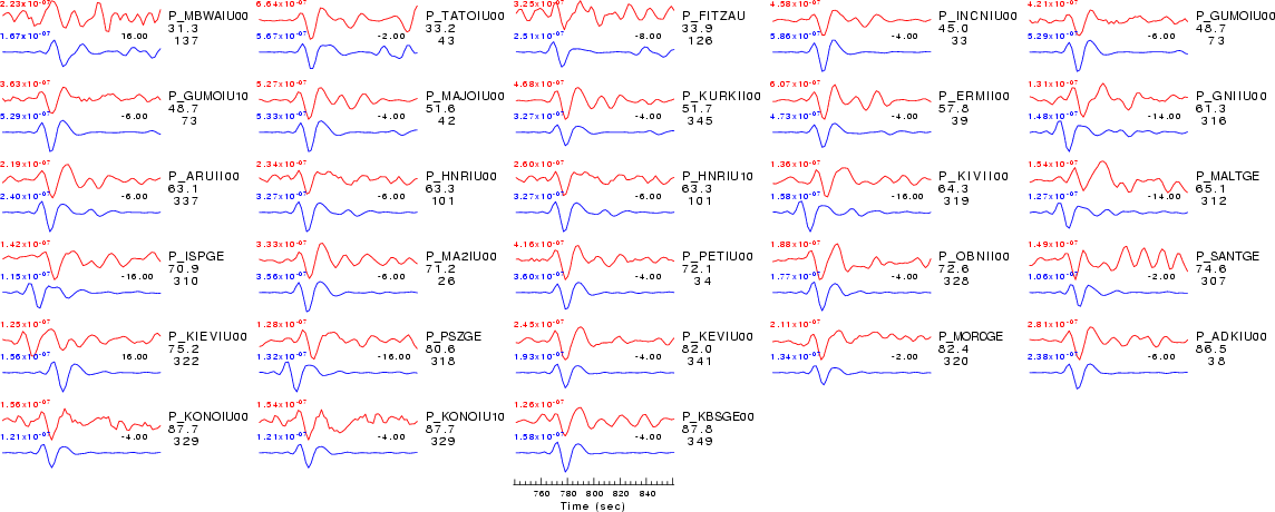 | Comparison of the observed traces (red) and solution predicted traces (blue) ordered in terms of increasing epicentral distance. Each pair of traces is annotated with the station name, epicentral distance in degrees, source to station azimuth in degrees. Each pair of traces is plotted with the same scale and the peak amplitudes are indicated at the lect of each trace. Finally the time shift between the P-wave first arrival picked and the the theoretical P-wave first arrival in the predicted trace is indicated, with a positive sign indicating that the predicted trace has been shifted to the right by the given number of seconds. as a function of source to station azimuth in degrees (D). The purpose of this display is to highlight the azimuthal dependence on the first motion. The traces are annotated with the station name at the top. |
