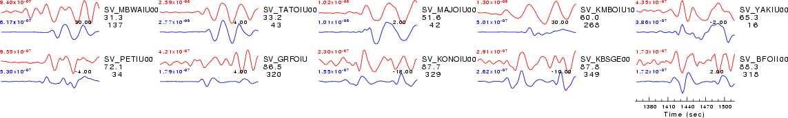 hp c 0.0167 2 lp c 0.0833 2 int br c 0.12 0.25 n 4 p 2The traces were next integrated to ground displacment in meters. Finally the observed data are interpolated to ahve the same sampling at the Green's functions.