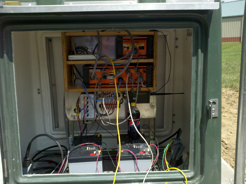 Electronics enclosure - spread spectrum telemetry, antenna, solar charger, Q330 data recorder, Q330 baler, router and batteries