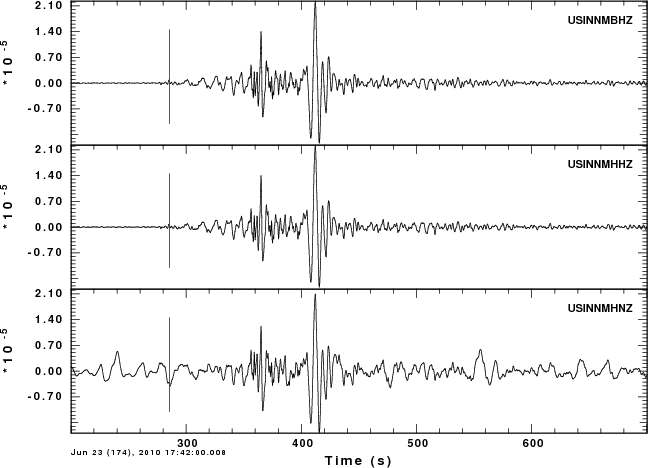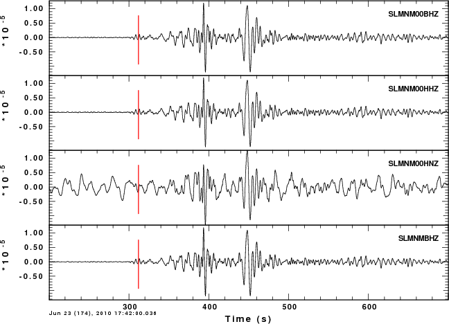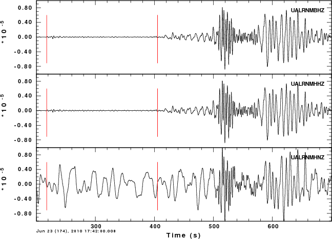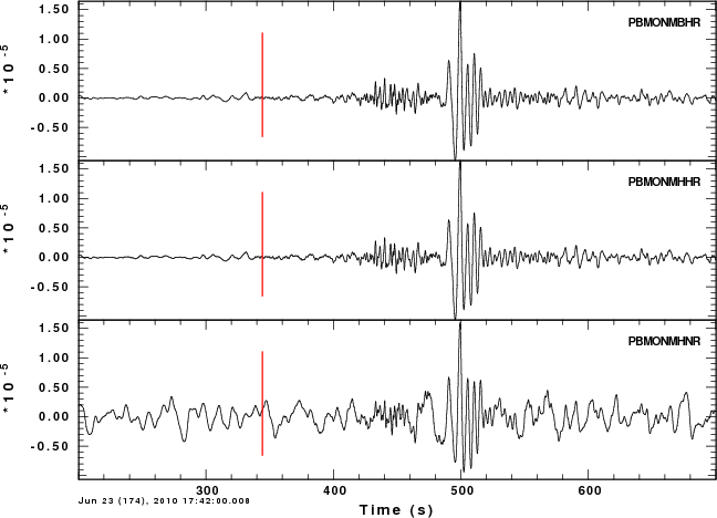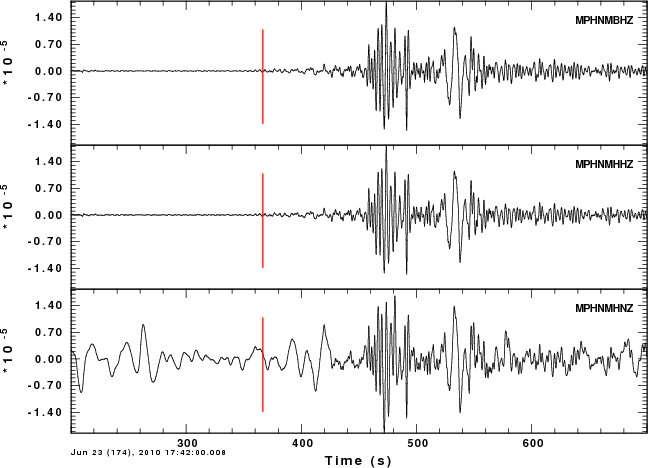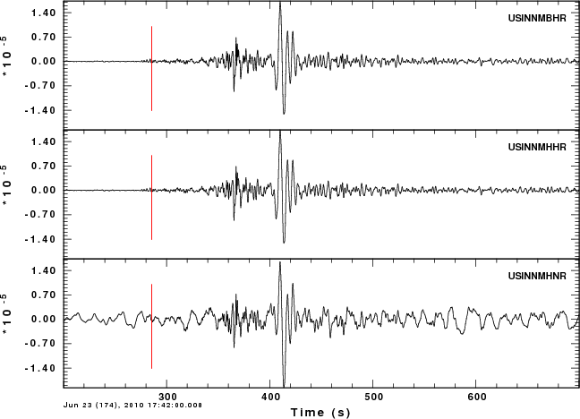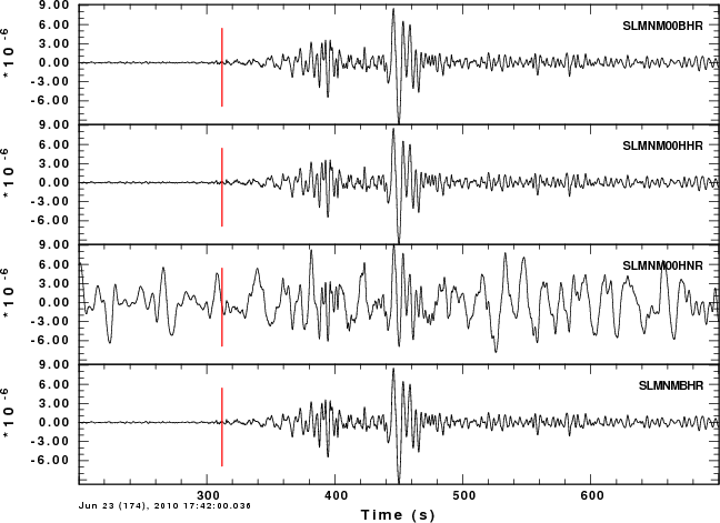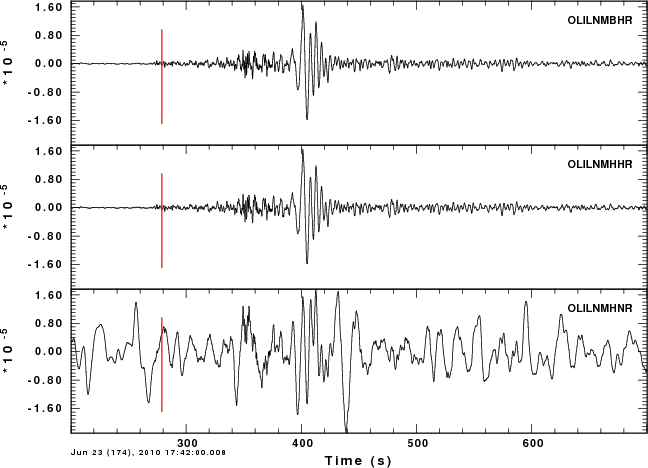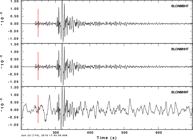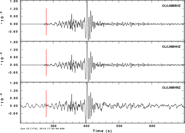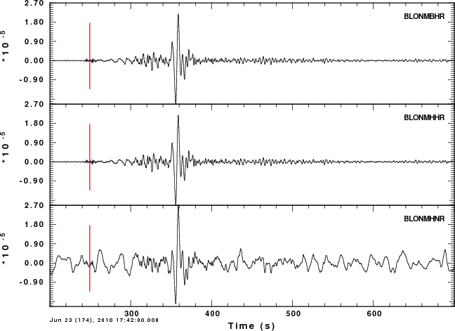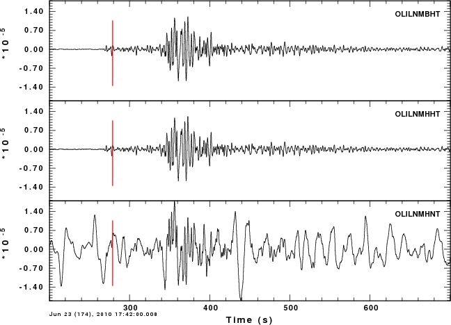The following compares ground velocity in m/sec in the 0.05 - 0.2 Hz band for the Quebec Earthquake of 2010/06/23.