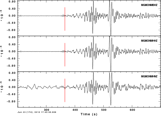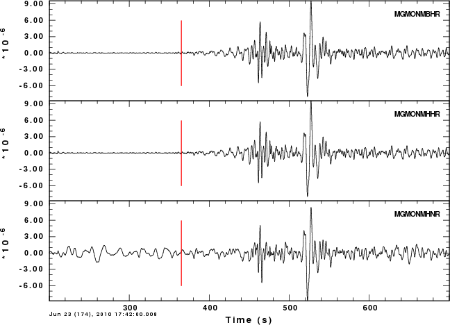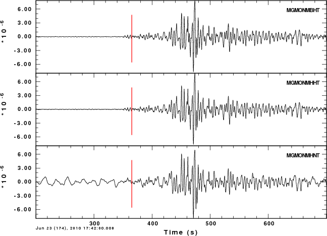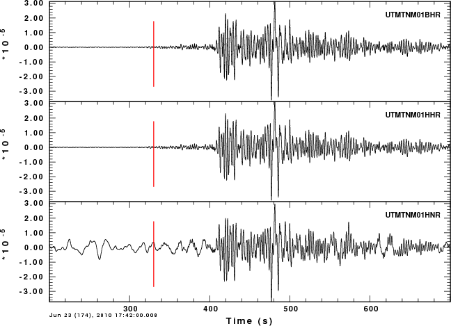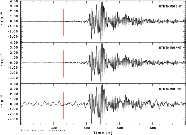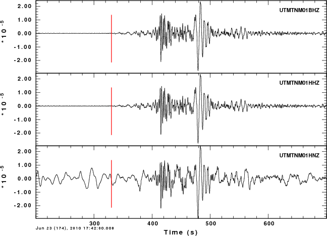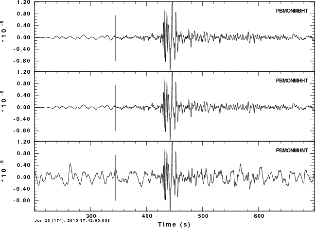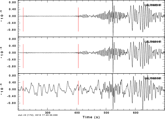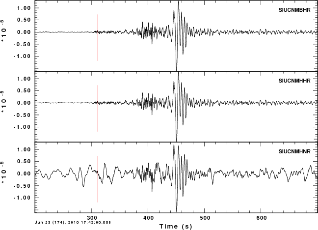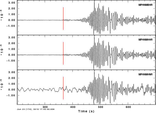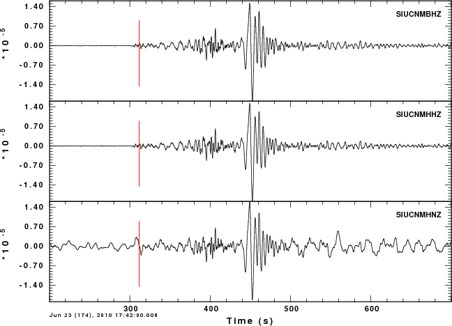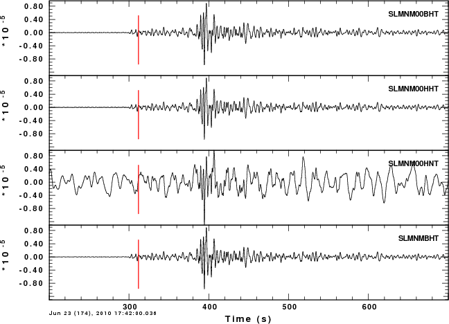 The following compares ground velocity in m/sec in the 0.05 - 0.2 Hz band for the Quebec Earthquake of 2010/06/23.