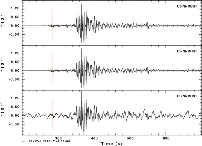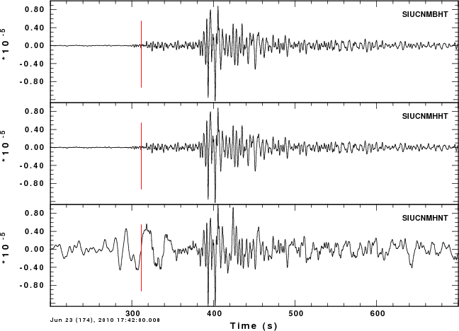 Note these are vertical, radial and transverse with respect to the earthquake source. The radial and transverse are derived from the NS and EW components. If there is a problem with either of the horizontals then both the radial and transverse will be affected.