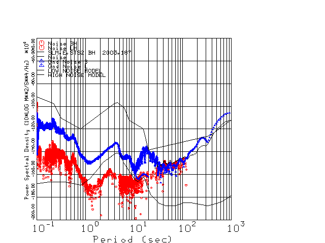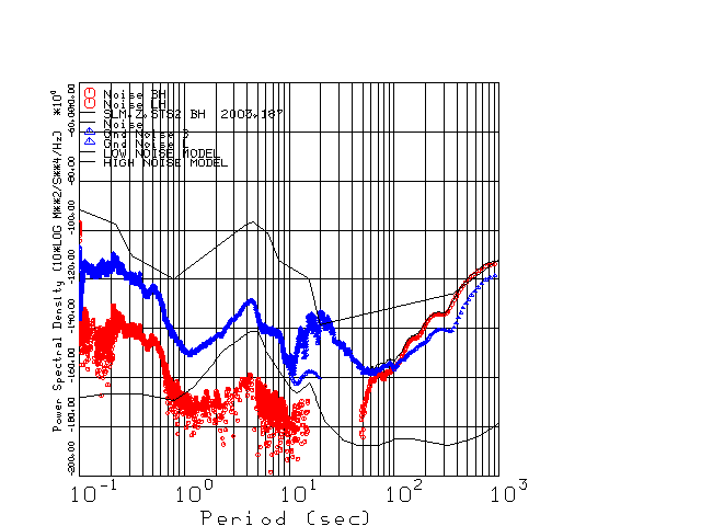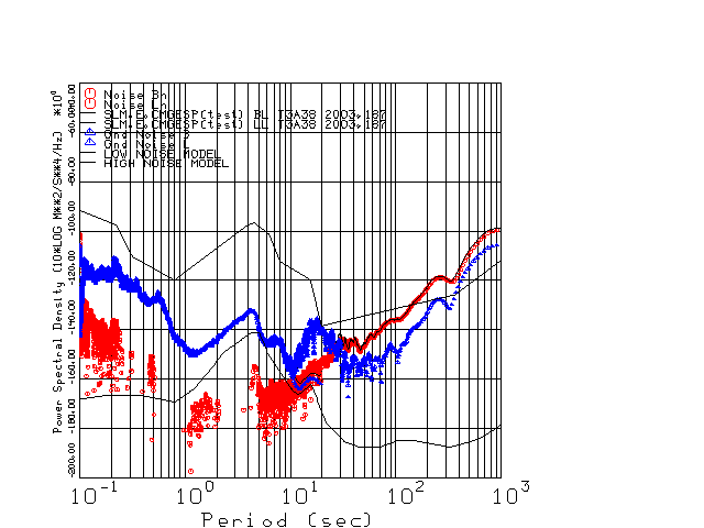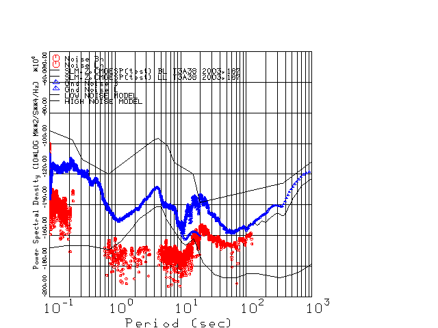 This page presents the results for Day 187 2003 and a direct comparison of the STS-2 to CMG3-ESP SN T3A38 L channel). because of low teleseismic activity. 17 data segments are usually taken hourly starting at 0000 through 1700. 8192 time samples are used (~90 sec for 20 sps data stream) and 8192 sec for the 1 sps data stream. The noise results from the 20Hz and 1Hz data streams overlap at a 10 second period.