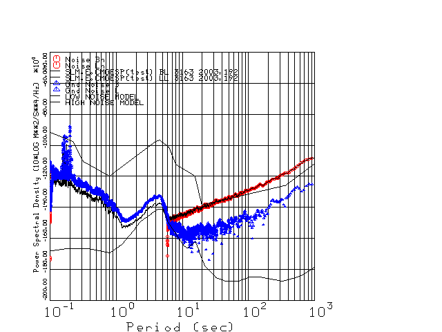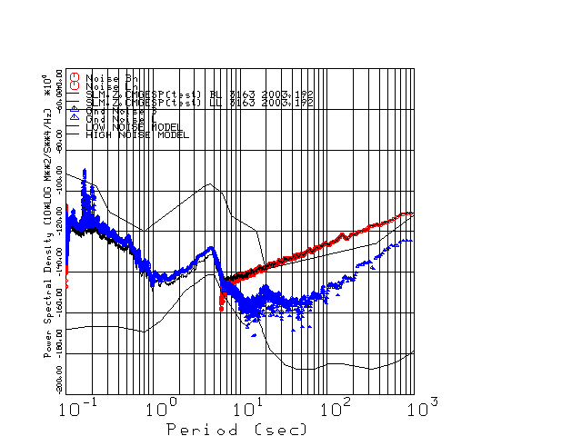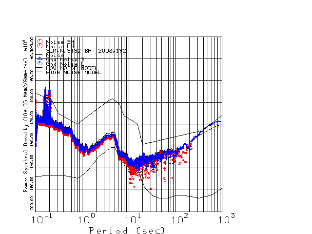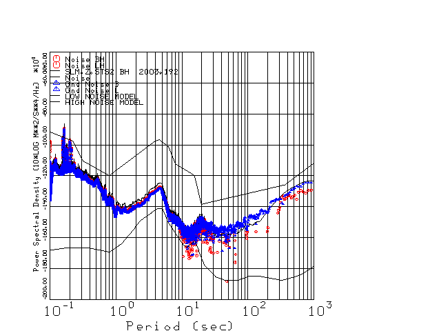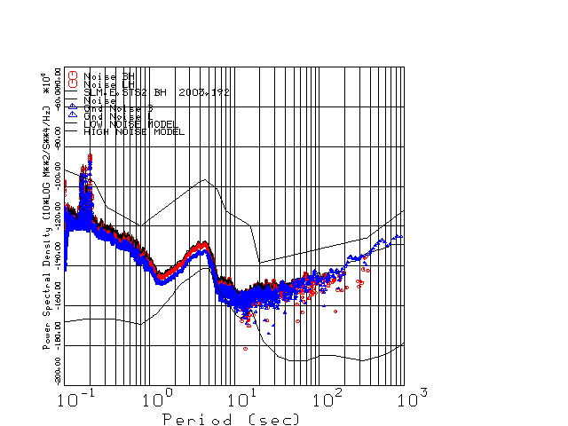 This page presents the results for Day 192 2003 and a direct comparison of the STS-2 to CMG3-ESP SN 3163 L channel). because of low teleseismic activity. 17 data segments are usually taken hourly starting at 0000 through 1700. 8192 time samples are used (~90 sec for 20 sps data stream) and 8192 sec for the 1 sps data stream. The noise results from the 20Hz and 1Hz data streams overlap at a 10 second period.