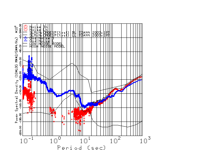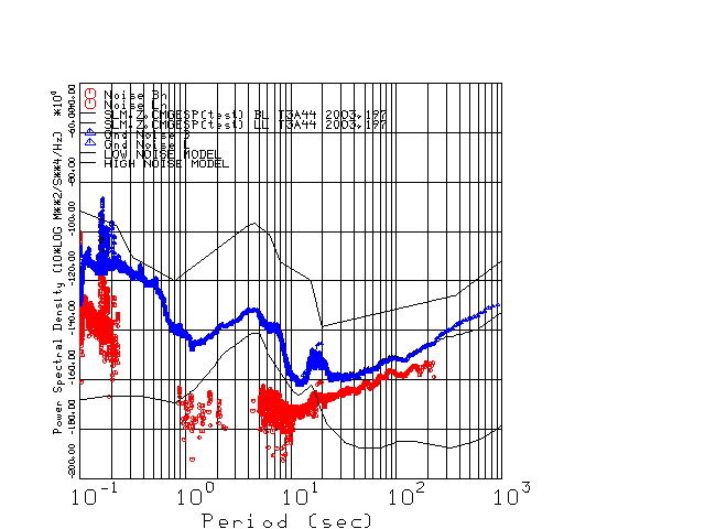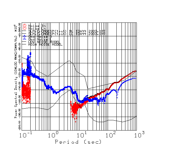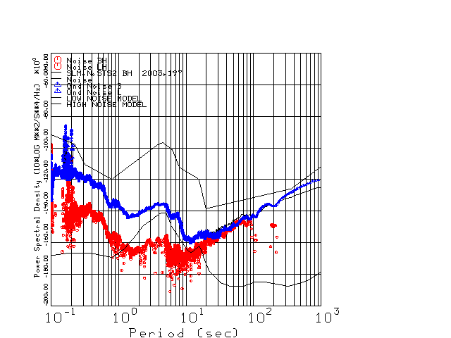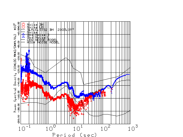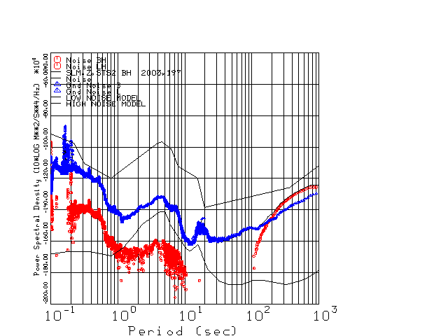This page presents the results for Day 197 2003 and a direct comparison of the STS-2 to CMG3-ESP SN T3A44 L channel). because of low teleseismic activity. 17 data segments are usually taken hourly starting at 0000 through 1700. 8192 time samples are used (~90 sec for 20 sps data stream) and 8192 sec for the 1 sps data stream. The noise results from the 20Hz and 1Hz data streams overlap at a 10 second period.