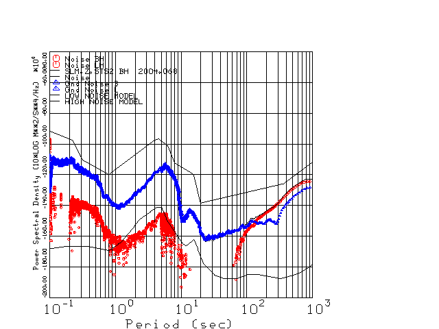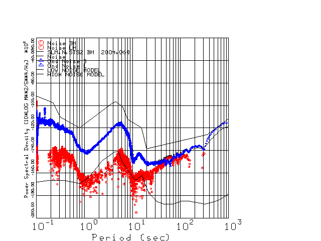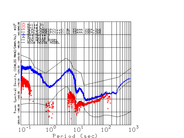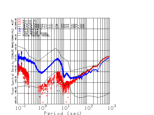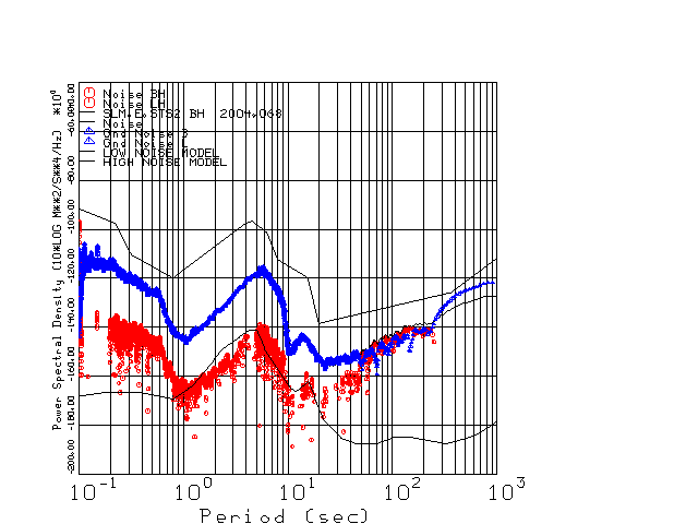 This page presents the results for Day 068 2004 and a direct comparison of the STS-2 to CMG3-ESP SN T3A44 L channel). because of low teleseismic activity. 17 data segments are usually taken hourly starting at 0000 through 1700. 8192 time samples are used (~90 sec for 20 sps data stream) and 8192 sec for the 1 sps data stream. The noise results from the 20Hz and 1Hz data streams overlap at a 10 second period.