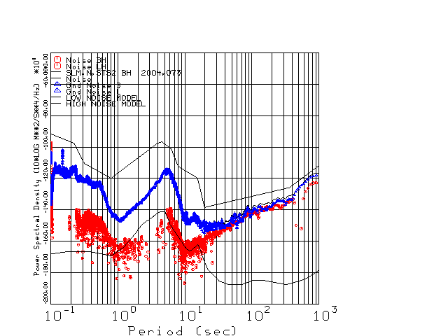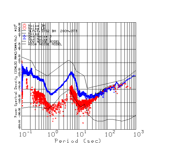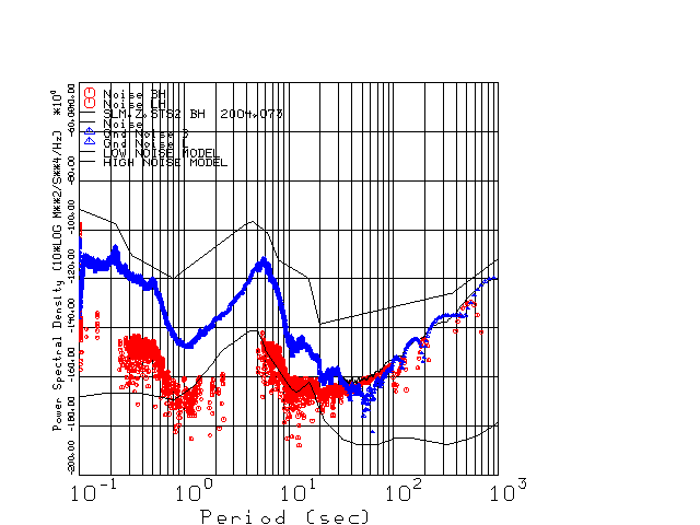 This page presents the results for Day 073 2004 and a direct comparison of the STS-2 to Trillium SN 036 L channel). because of low teleseismic activity. 17 data segments are usually taken hourly starting at 0000 through 1700. 8192 time samples are used (~90 sec for 20 sps data stream) and 8192 sec for the 1 sps data stream. The noise results from the 20Hz and 1Hz data streams overlap at a 10 second period.