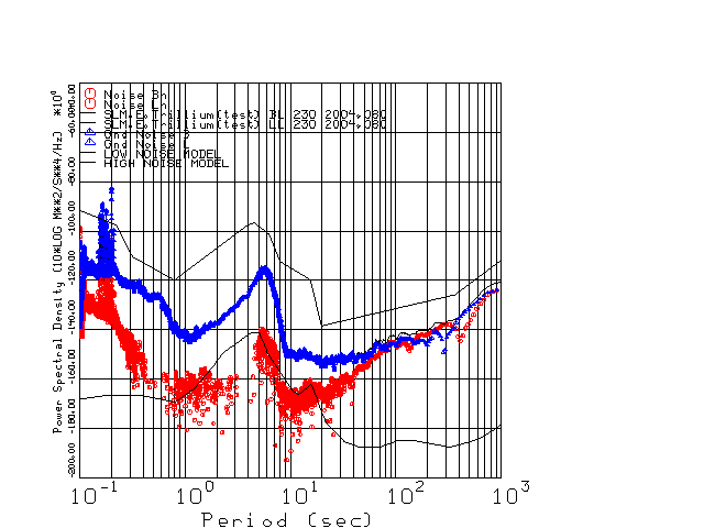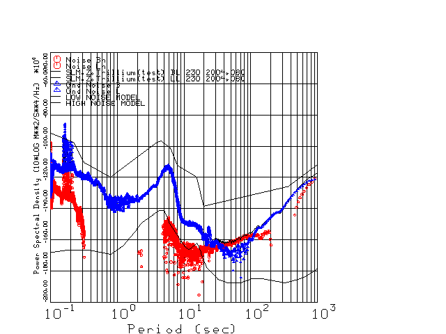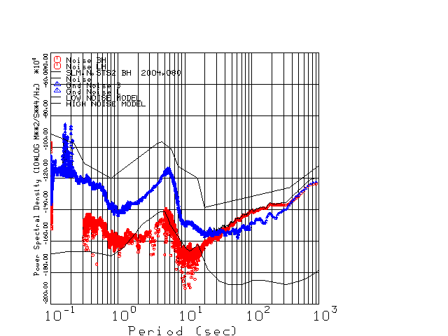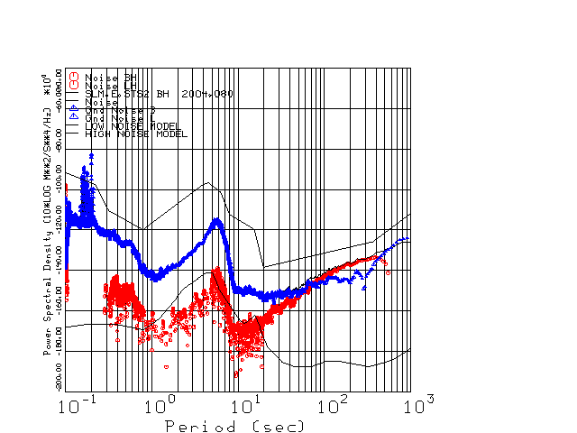 This page presents the results for Day 080 2004 and a direct comparison of the STS-2 to Trillium SN 230 L channel). because of low teleseismic activity. 17 data segments are usually taken hourly starting at 0000 through 1700. 8192 time samples are used (~90 sec for 20 sps data stream) and 8192 sec for the 1 sps data stream. The noise results from the 20Hz and 1Hz data streams overlap at a 10 second period.