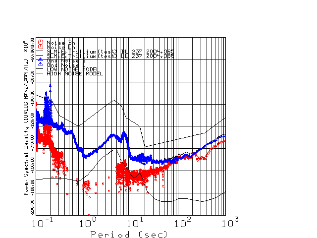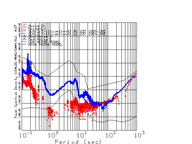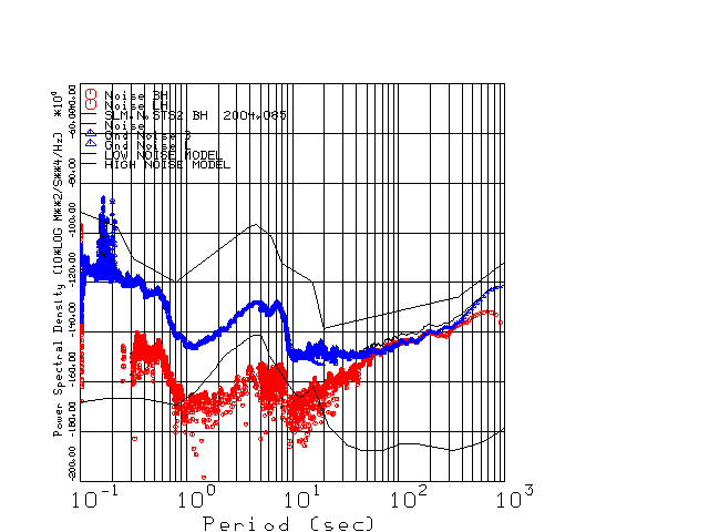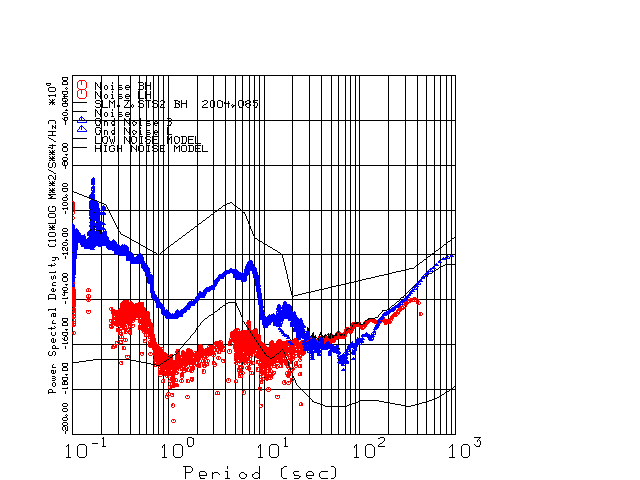 This page presents the results for Day 085 2004 and a direct comparison of the STS-2 to Trillium SN 237 L channel). because of low teleseismic activity. 17 data segments are usually taken hourly starting at 0000 through 1700. 8192 time samples are used (~90 sec for 20 sps data stream) and 8192 sec for the 1 sps data stream. The noise results from the 20Hz and 1Hz data streams overlap at a 10 second period.