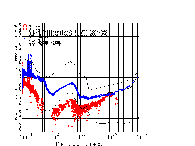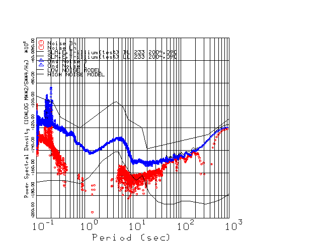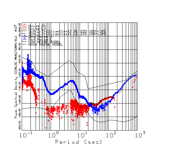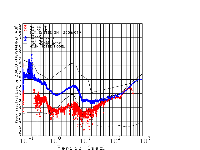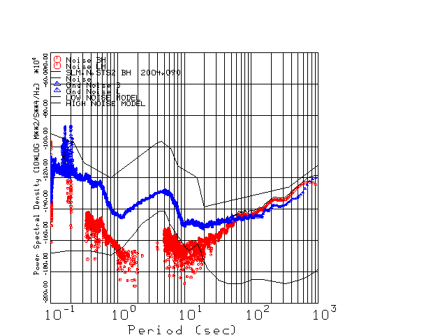 This page presents the results for Day 090 2004 and a direct comparison of the STS-2 to Trillium SN 233 L channel). because of low teleseismic activity. 17 data segments are usually taken hourly starting at 0000 through 1700. 8192 time samples are used (~90 sec for 20 sps data stream) and 8192 sec for the 1 sps data stream. The noise results from the 20Hz and 1Hz data streams overlap at a 10 second period.