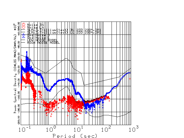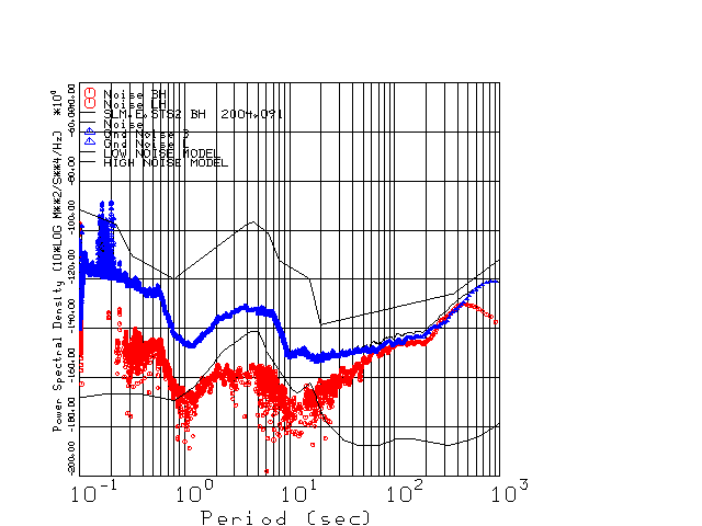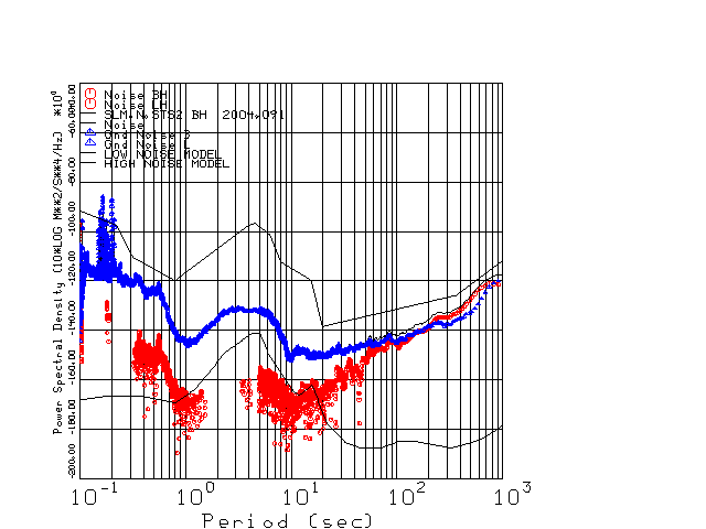 This page presents the results for Day 091 2004 and a direct comparison of the STS-2 to Trillium SN 233 L channel). because of low teleseismic activity. 17 data segments are usually taken hourly starting at 0000 through 1700. 8192 time samples are used (~90 sec for 20 sps data stream) and 8192 sec for the 1 sps data stream. The noise results from the 20Hz and 1Hz data streams overlap at a 10 second period.