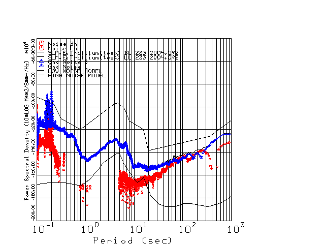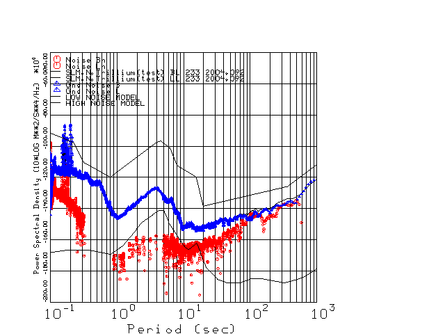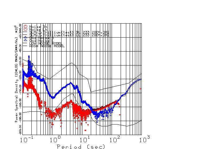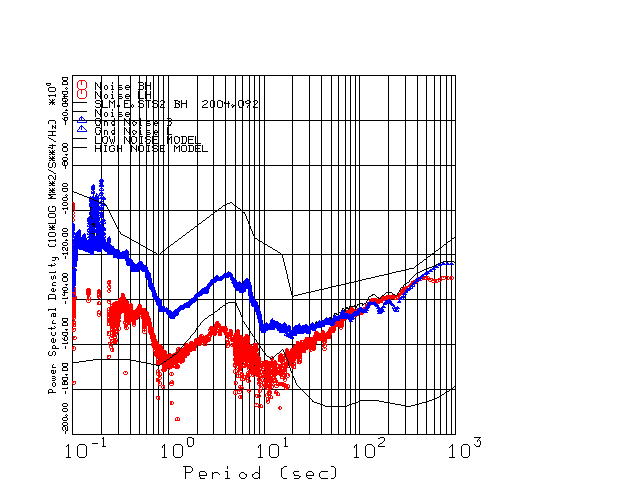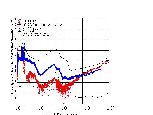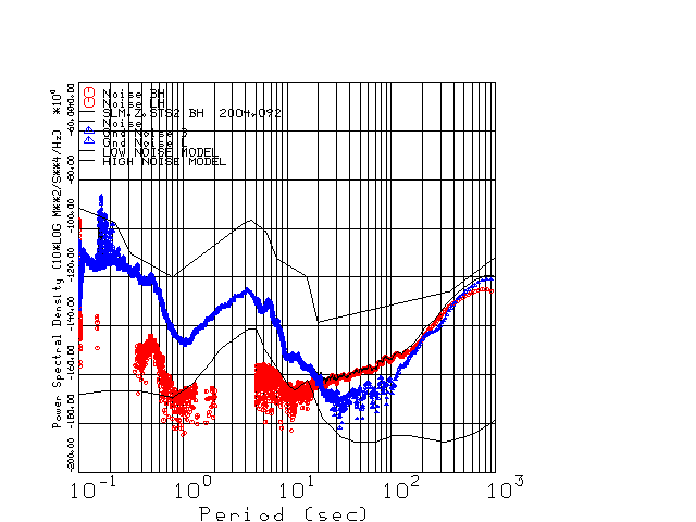 This page presents the results for Day 092 2004 and a direct comparison of the STS-2 to Trillium SN 233 L channel). because of low teleseismic activity. 17 data segments are usually taken hourly starting at 0000 through 1700. 8192 time samples are used (~90 sec for 20 sps data stream) and 8192 sec for the 1 sps data stream. The noise results from the 20Hz and 1Hz data streams overlap at a 10 second period.