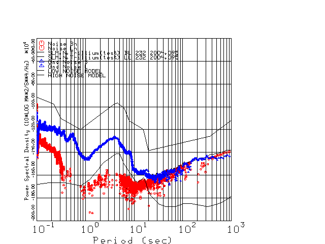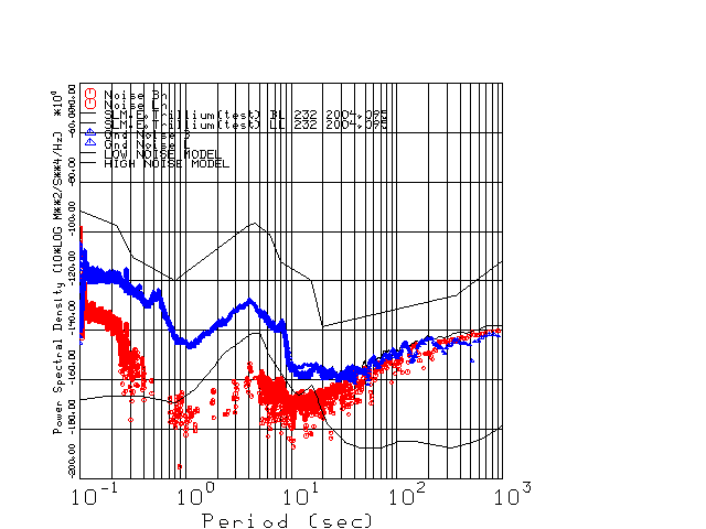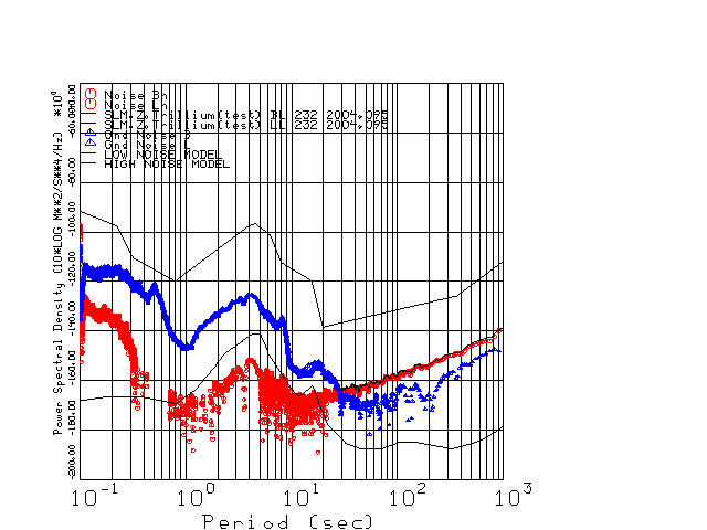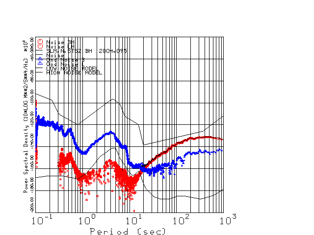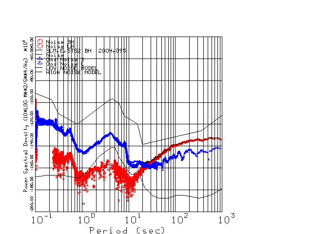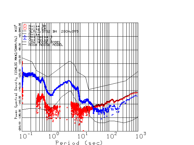 This page presents the results for Day 095 2004 and a direct comparison of the STS-2 to Trillium SN 232 L channel). because of low teleseismic activity. 17 data segments are usually taken hourly starting at 0000 through 1700. 8192 time samples are used (~90 sec for 20 sps data stream) and 8192 sec for the 1 sps data stream. The noise results from the 20Hz and 1Hz data streams overlap at a 10 second period.