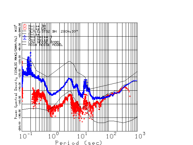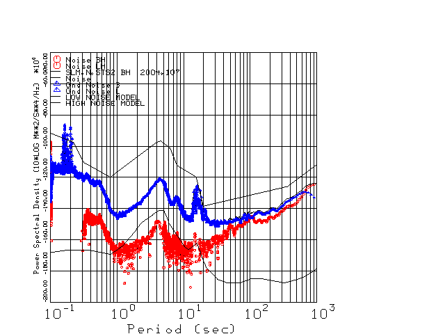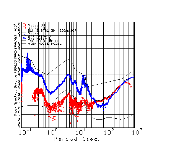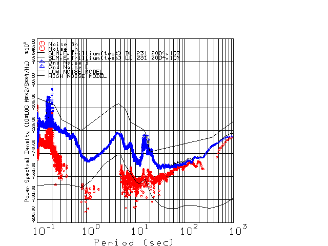 This page presents the results for Day 107 2004 and a direct comparison of the STS-2 to Trillium SN 231 L channel). because of low teleseismic activity. 17 data segments are usually taken hourly starting at 0000 through 1700. 8192 time samples are used (~90 sec for 20 sps data stream) and 8192 sec for the 1 sps data stream. The noise results from the 20Hz and 1Hz data streams overlap at a 10 second period.