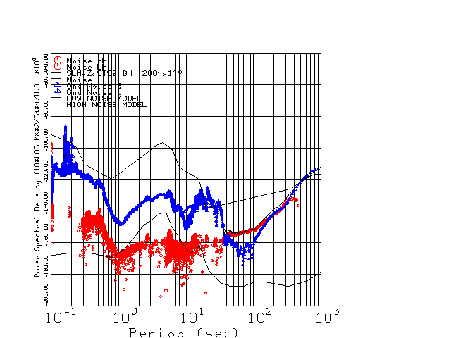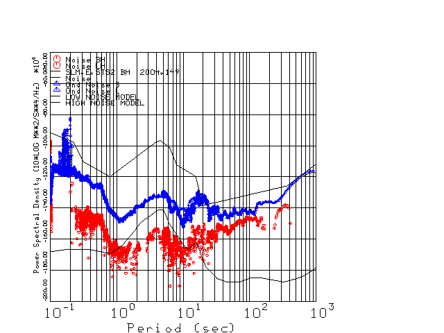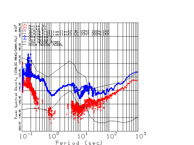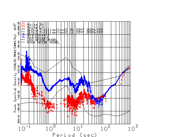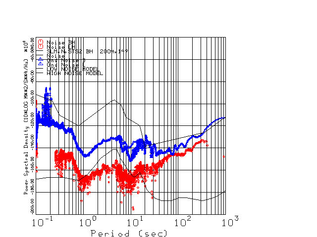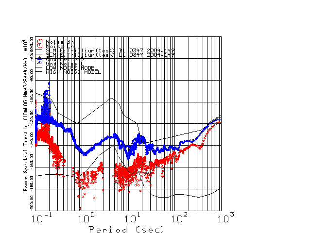 This page presents the results for Day 149 2004 and a direct comparison of the STS-2 to Trillium SN 0347 L channel). because of low teleseismic activity. 17 data segments are usually taken hourly starting at 0000 through 1700. 8192 time samples are used (~90 sec for 20 sps data stream) and 8192 sec for the 1 sps data stream. The noise results from the 20Hz and 1Hz data streams overlap at a 10 second period.