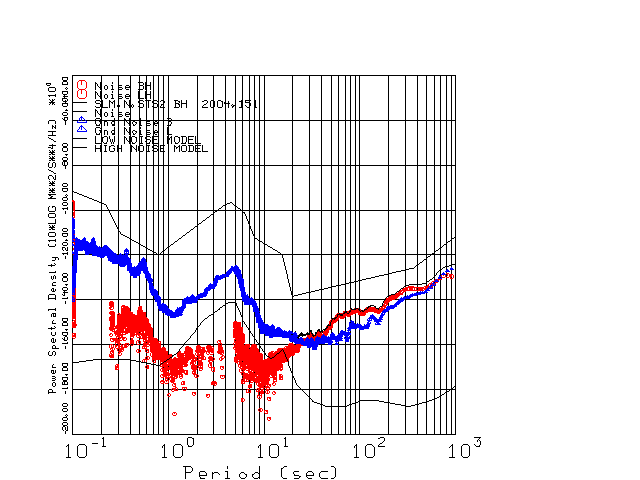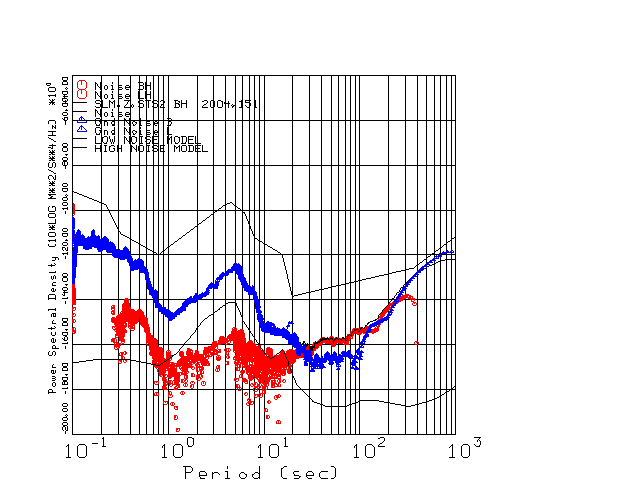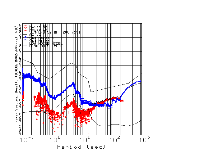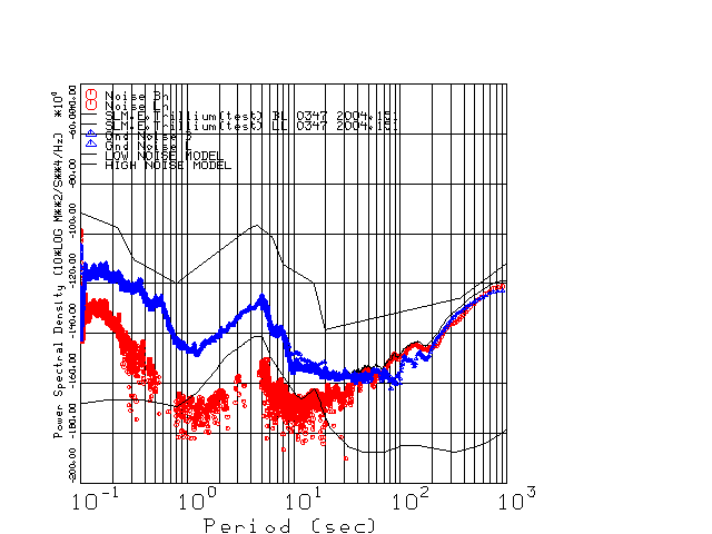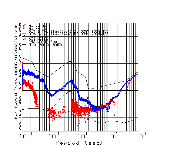 This page presents the results for Day 151 2004 and a direct comparison of the STS-2 to Trillium SN 0347 L channel). because of low teleseismic activity. 17 data segments are usually taken hourly starting at 0000 through 1700. 8192 time samples are used (~90 sec for 20 sps data stream) and 8192 sec for the 1 sps data stream. The noise results from the 20Hz and 1Hz data streams overlap at a 10 second period.