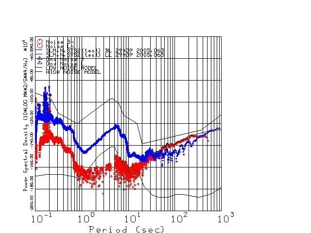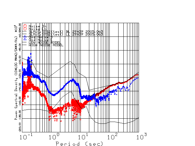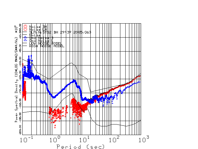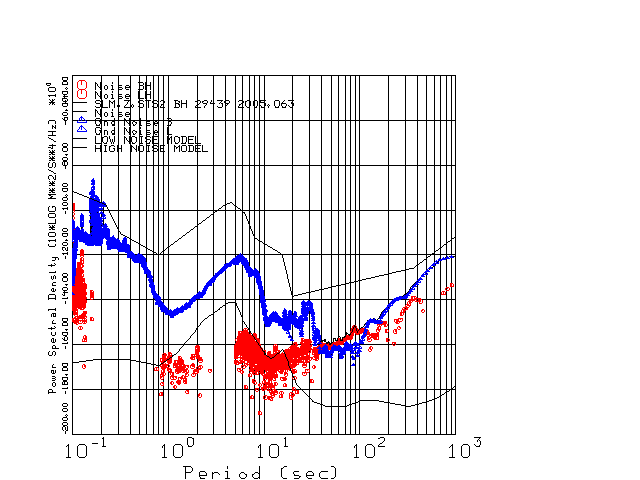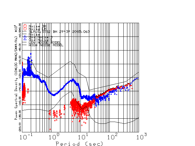 This page presents the results for Day 063 2005 and a direct comparison of the STS-2 to Trillium SN 29439 L channel). because of low teleseismic activity. 17 data segments are usually taken hourly starting at 0000 through 1700. 8192 time samples are used (~90 sec for 20 sps data stream) and 8192 sec for the 1 sps data stream. The noise results from the 20Hz and 1Hz data streams overlap at a 10 second period.