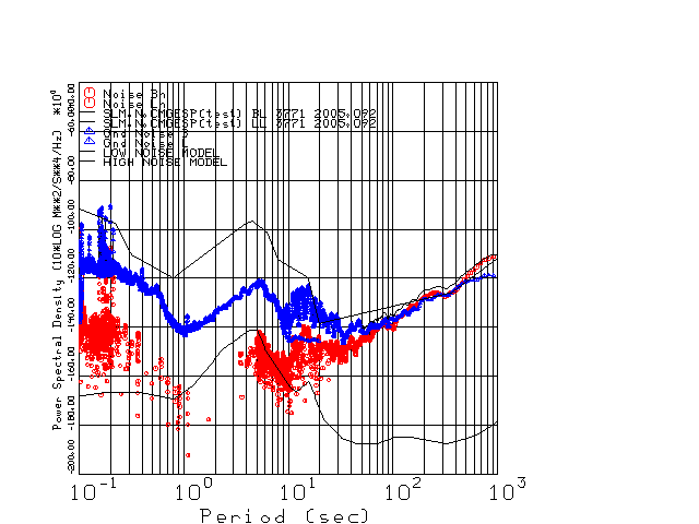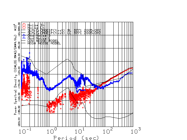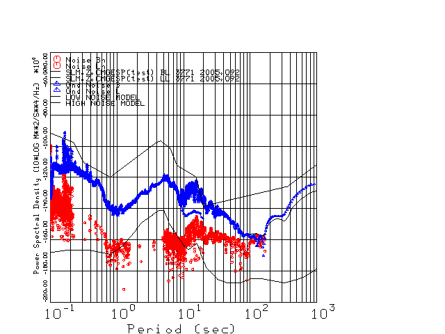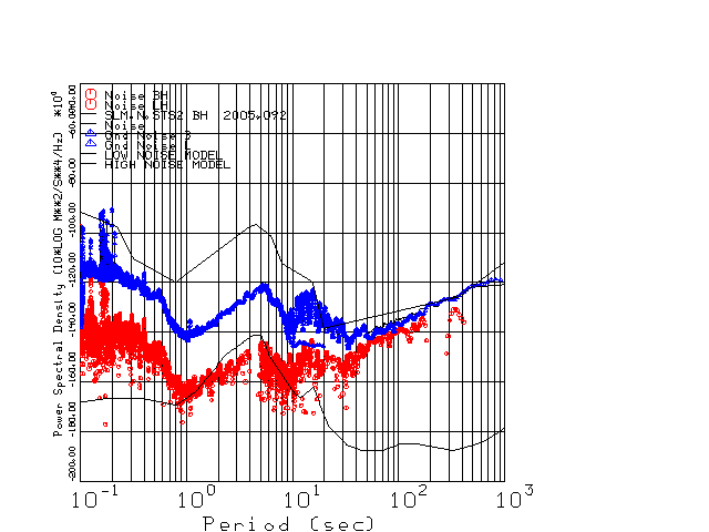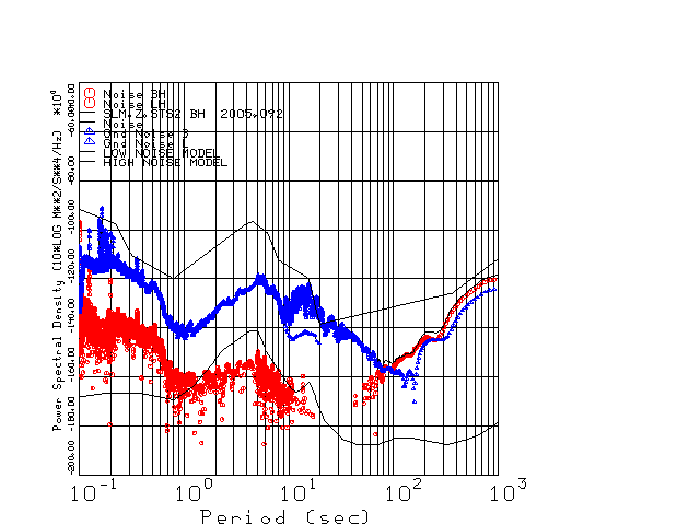 This page presents the results for Day 092 2005 and a direct comparison of the STS-2 to CMG3-ESP SN 3771 L channel). because of low teleseismic activity. 17 data segments are usually taken hourly starting at 0000 through 1700. 8192 time samples are used (~90 sec for 20 sps data stream) and 8192 sec for the 1 sps data stream. The noise results from the 20Hz and 1Hz data streams overlap at a 10 second period.
