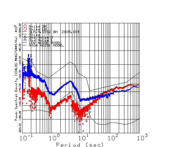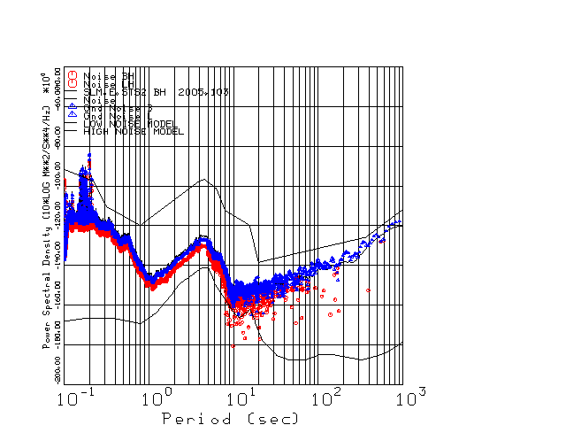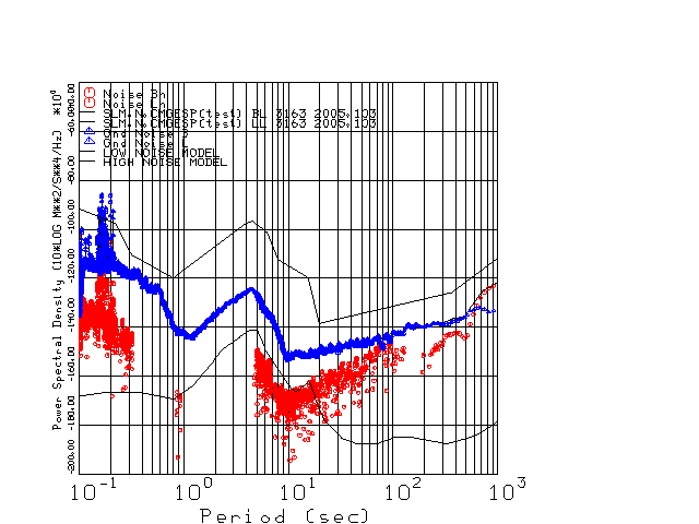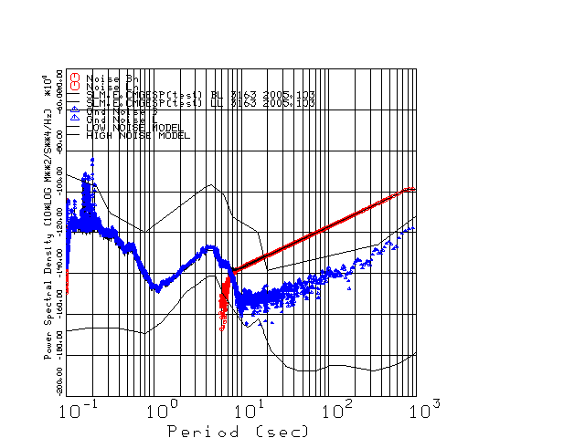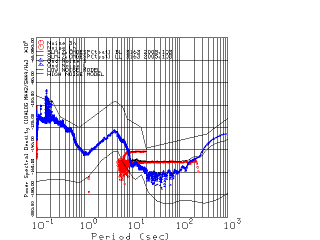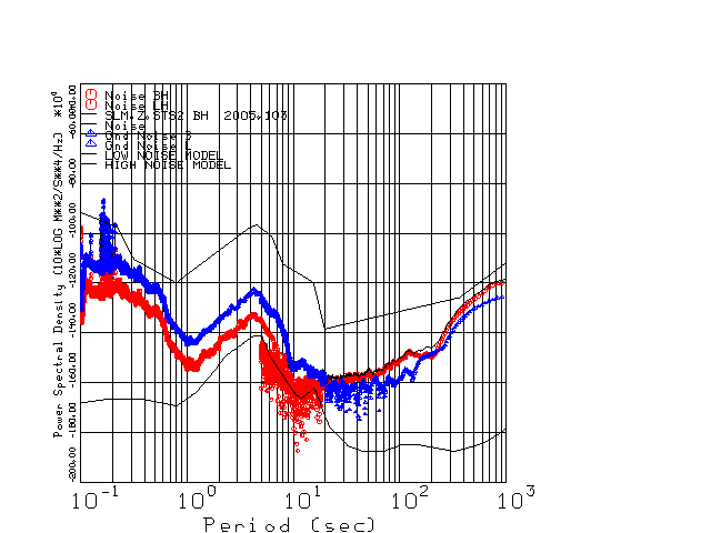 This page presents the results for Day 103 2005 and a direct comparison of the STS-2 to CMG3-ESP SN 3163 L channel). because of low teleseismic activity. 17 data segments are usually taken hourly starting at 0000 through 1700. 8192 time samples are used (~90 sec for 20 sps data stream) and 8192 sec for the 1 sps data stream. The noise results from the 20Hz and 1Hz data streams overlap at a 10 second period.