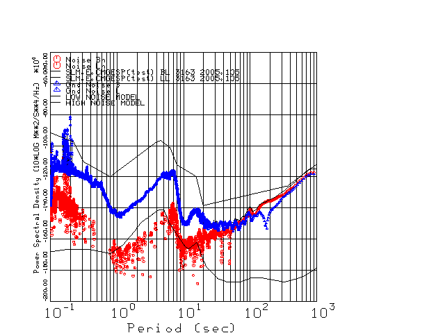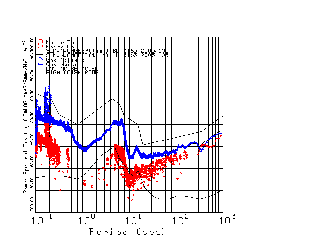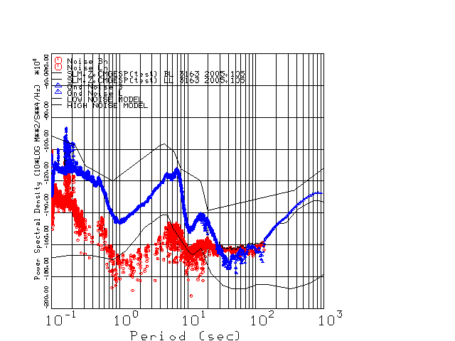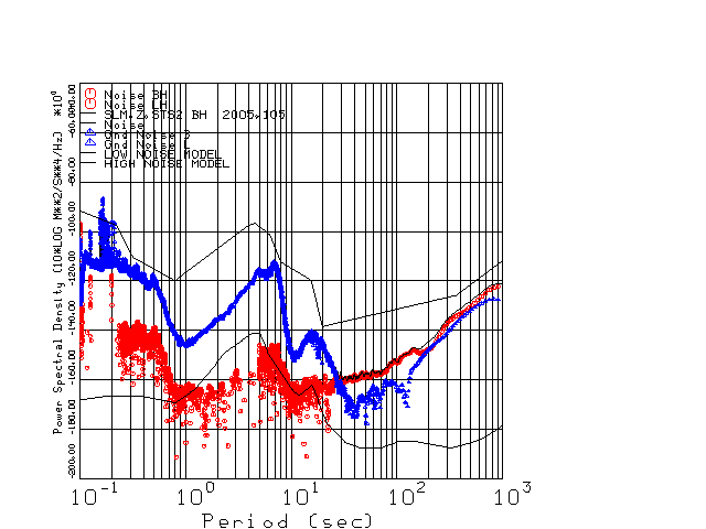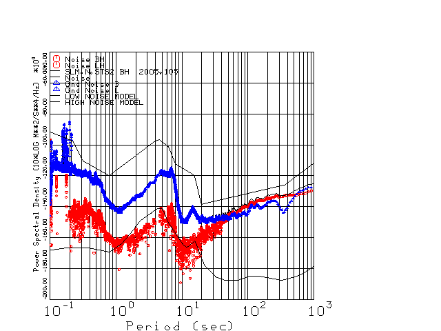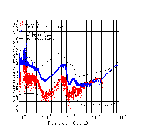 This page presents the results for Day 105 2005 and a direct comparison of the STS-2 to CMG3-ESP SN 3163 L channel). because of low teleseismic activity. 17 data segments are usually taken hourly starting at 0000 through 1700. 8192 time samples are used (~90 sec for 20 sps data stream) and 8192 sec for the 1 sps data stream. The noise results from the 20Hz and 1Hz data streams overlap at a 10 second period.