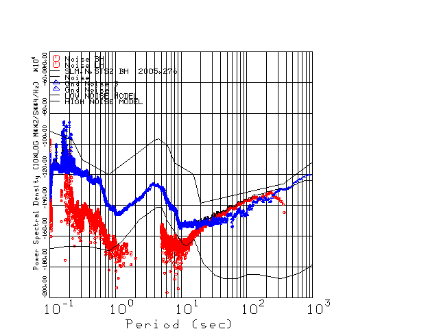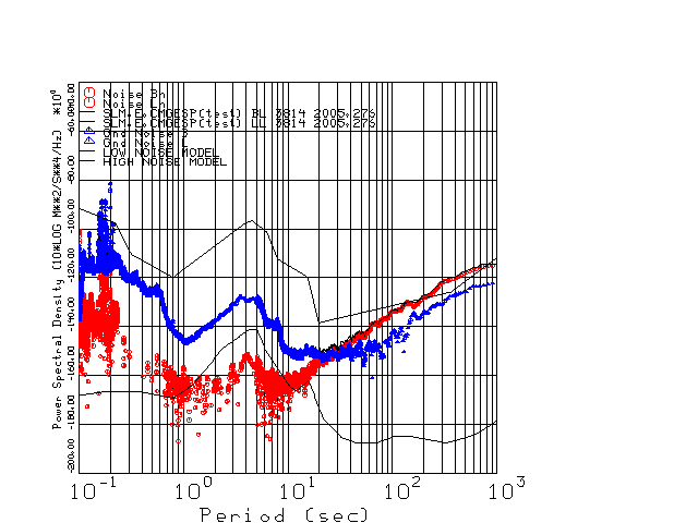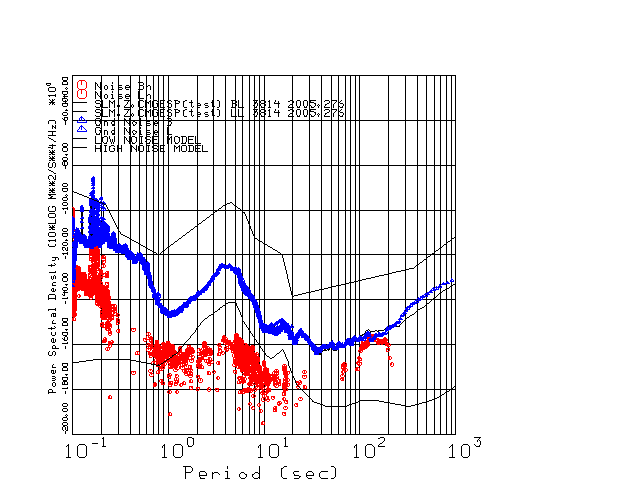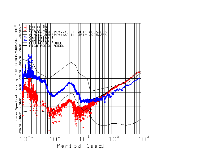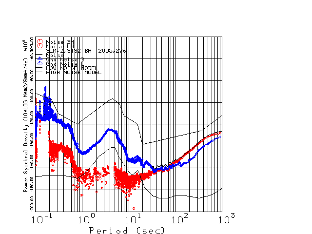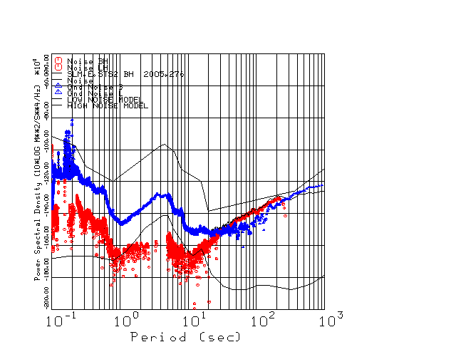 This page presents the results for Day 276 2005 and a direct comparison of the STS-2 to CMG3-ESP SN 3814 L channel). because of low teleseismic activity. 17 data segments are usually taken hourly starting at 0000 through 1700. 8192 time samples are used (~90 sec for 20 sps data stream) and 8192 sec for the 1 sps data stream. The noise results from the 20Hz and 1Hz data streams overlap at a 10 second period.