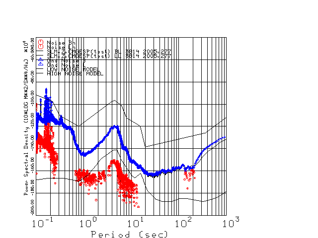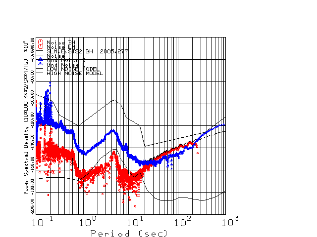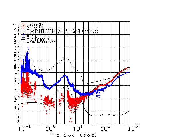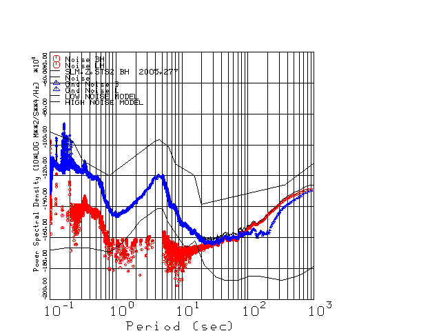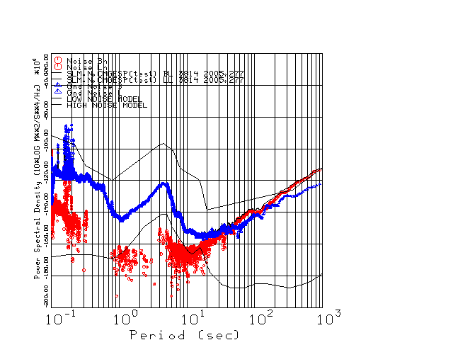 This page presents the results for Day 277 2005 and a direct comparison of the STS-2 to CMG3-ESP SN 3814 L channel). because of low teleseismic activity. 17 data segments are usually taken hourly starting at 0000 through 1700. 8192 time samples are used (~90 sec for 20 sps data stream) and 8192 sec for the 1 sps data stream. The noise results from the 20Hz and 1Hz data streams overlap at a 10 second period.