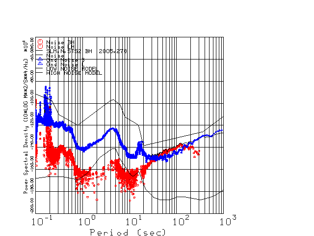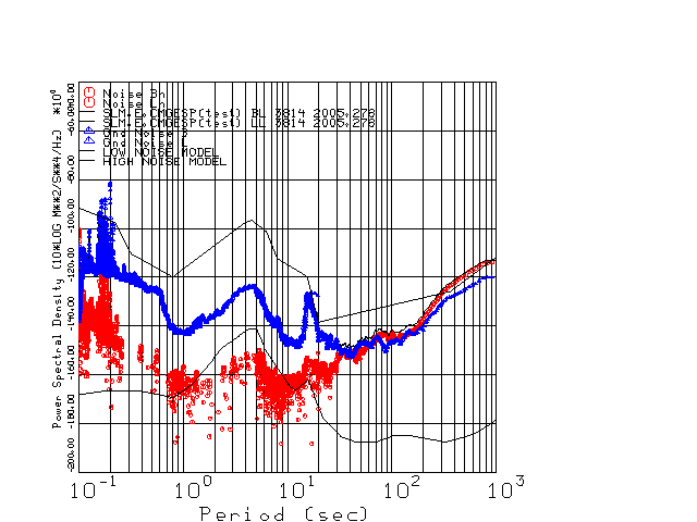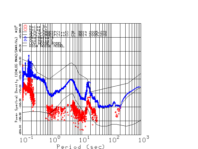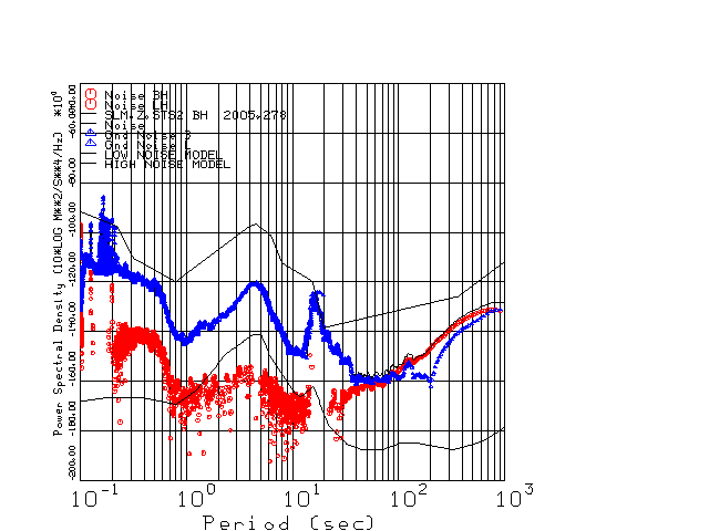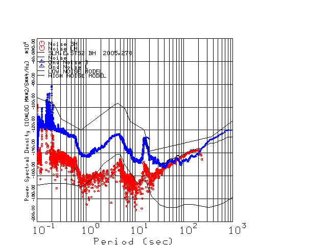 This page presents the results for Day 278 2005 and a direct comparison of the STS-2 to CMG3-ESP SN 3814 L channel). because of low teleseismic activity. 17 data segments are usually taken hourly starting at 0000 through 1700. 8192 time samples are used (~90 sec for 20 sps data stream) and 8192 sec for the 1 sps data stream. The noise results from the 20Hz and 1Hz data streams overlap at a 10 second period.