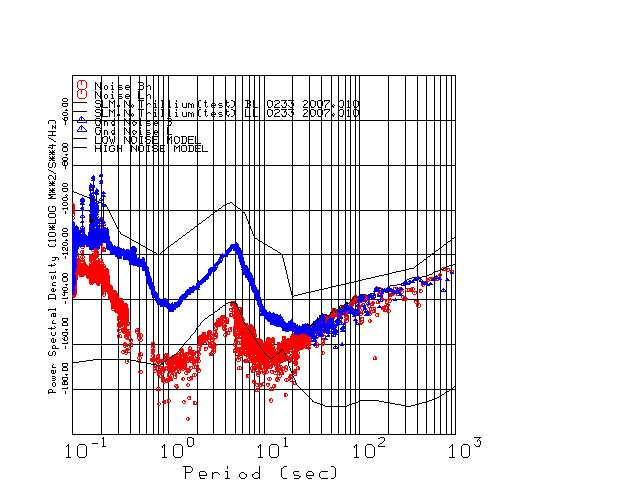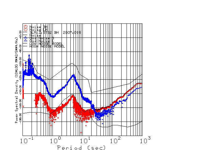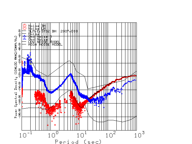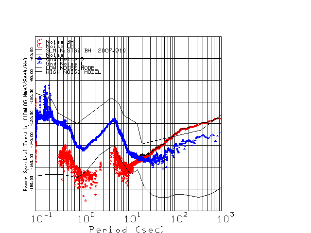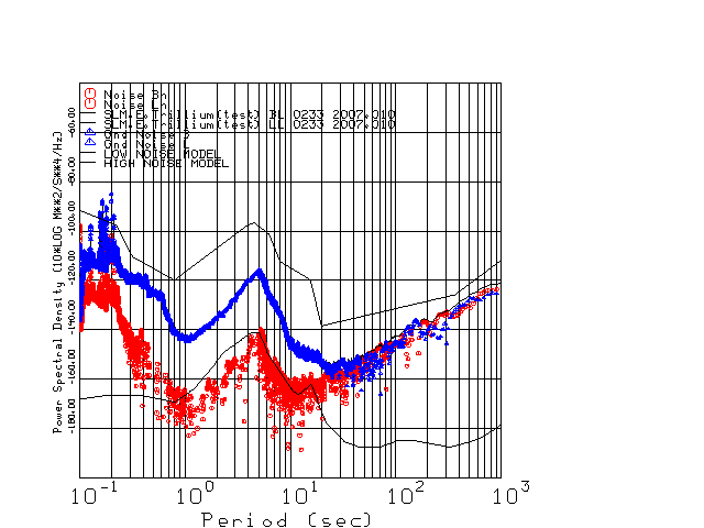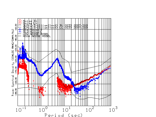 This page presents the results for Day 010 2007 and a direct comparison of the STS-2 to Trillium SN 0233 L channel). because of low teleseismic activity. 17 data segments are usually taken hourly starting at 0000 through 1700. 8192 time samples are used (~90 sec for 20 sps data stream) and 8192 sec for the 1 sps data stream. The noise results from the 20Hz and 1Hz data streams overlap at a 10 second period.